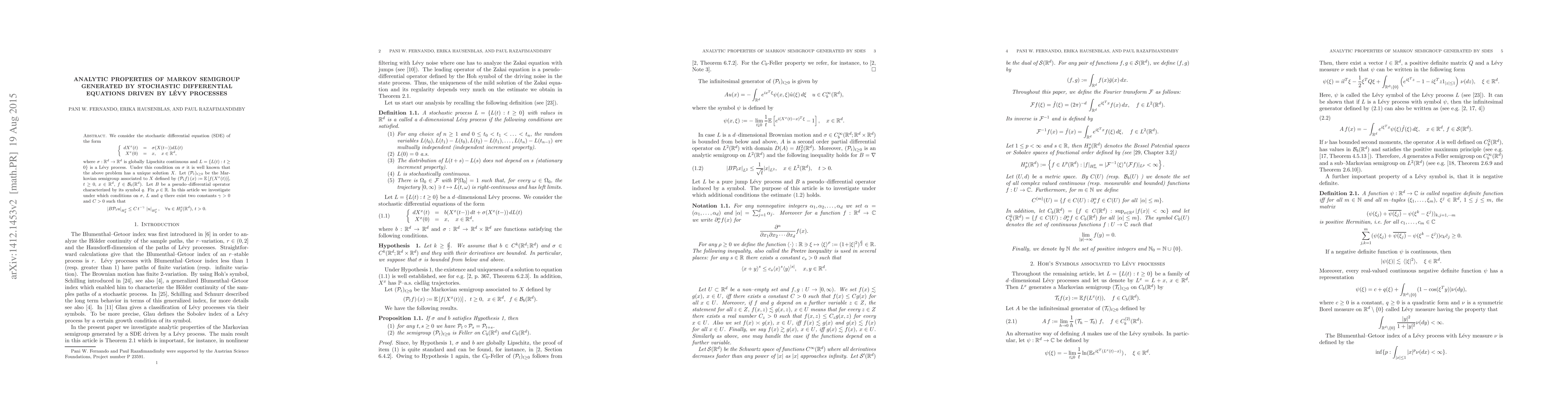 We consider the stochastic differential equations of the form \begin{equation*} \begin{cases} dX^ x(t) = \sigma(X(t-)) dL(t) \\ X^ x(0)=x,\quad x\in\mathbb{R}^ d, \end{cases} \end{equation*} where $\sigma:\mathbb{R}^ d\to \mathbb{R}^ d$ is Lipschitz continuous and $L=\{L(t):t\ge 0\}$ is a L\'evy process. Under this condition on $\sigma$ it is well known that the above problem has a unique solution $X$. Let $(\mathcal{P}_{t})_{t\ge0}$ be the Markovian semigroup associated to $X$ defined by $( \mathcal{P}_t f) (x) := \mathbb{E} [ f(X^ x(t))]$, $t\ge 0$, $x\in \mathbb{R}^d$, $f\in \mathcal{B}_b(\mathbb{R}^d)$. Let $B$ be a pseudo--differential operator characterized by its symbol $q$. Fix $\rho\in\mathbb{R}$. In this article we investigate under which conditions on $\sigma$, $L$ and $q$ there exist two constants $\gamma>0$ and $C>0$ such that $$ \lvert B \mathcal{P}_t u \rvert_{H^\rho_2} \le C \, t^{-\gamma} \,\lvert u \rvert_{H^\rho_2}, \quad \forall u \in {H^\rho_2}(\mathbb{R}^d ),\, t>0. $$