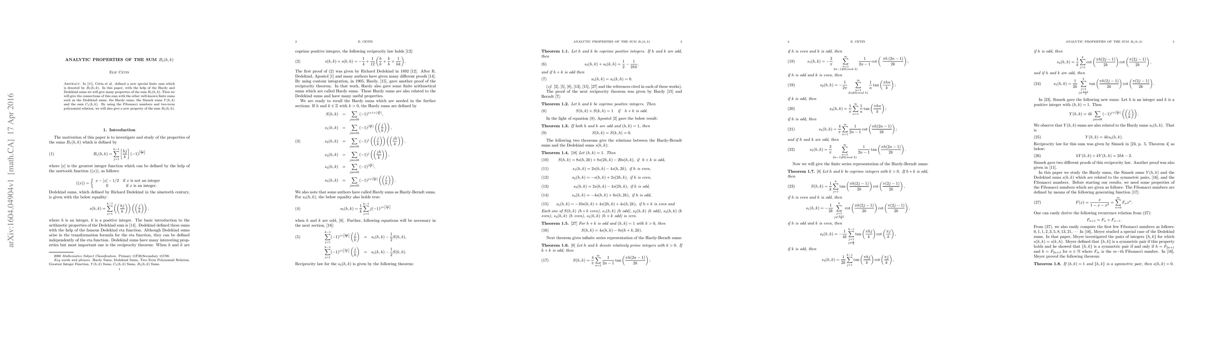 This paper explores properties of a new special finite sum $B_{1}(h,k)$, connecting it to known sums like Dedekind and Hardy sums, and introducing a new property via Fibonacci numbers.