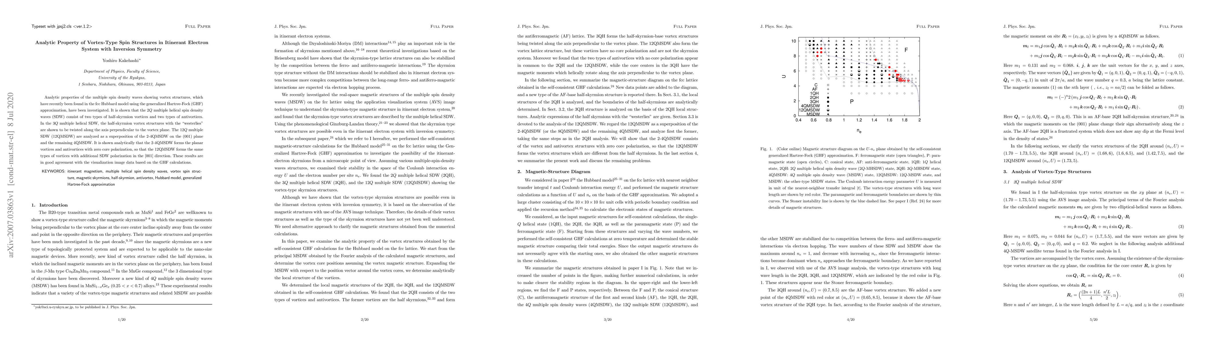 Analytic properties of the multiple spin density waves showing vortex structures, which have recently been found in the fcc Hubbard model using the generalized Hartree-Fock (GHF) approximation, have been investigated. It is shown that the 2Q multiple helical spin density waves (SDW) consist of two types of half-skyrmion vortices and two types of antivortices. In the 3Q multiple helical SDW, the half-skyrmion vortex structures with the "westerlies" are shown to be twisted along the axis perpendicular to the vortex plane. The 12Q multiple SDW (12QMSDW) are analyzed as a superposition of the 2-4QMSDW on the (001) plane and the remaining 4QMSDW. It is shown analytically that the 2-4QMSDW forms the planar vortices and antivortices with zero core polarization, so that the 12QMSDW forms the same types of vortices with additional SDW polarization in the [001] direction. These results are in good agreement with the visualization image data based on the GHF calculations.