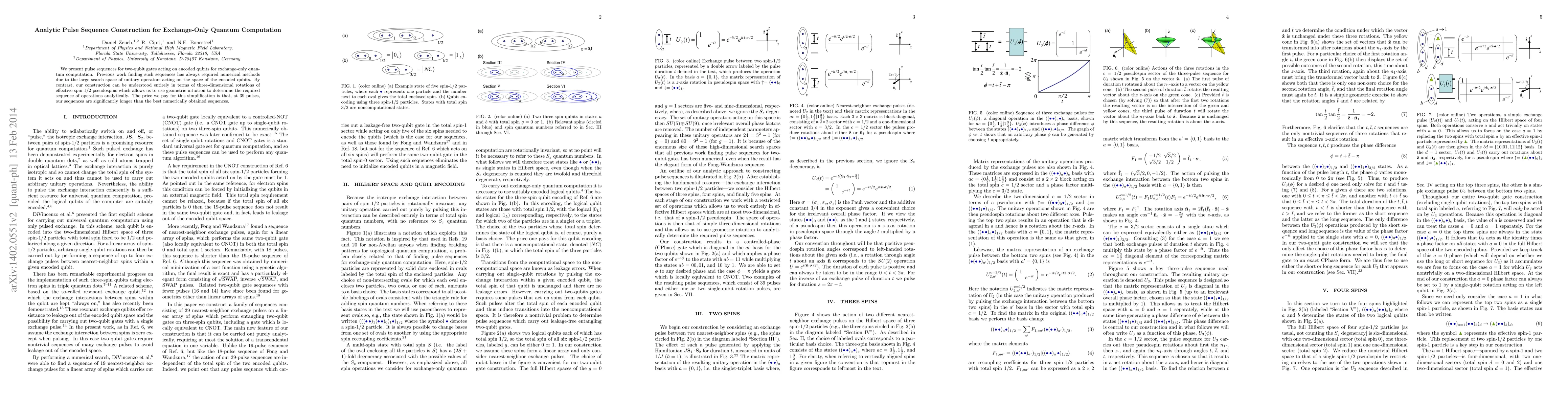 We present pulse sequences for two-qubit gates acting on encoded qubits for exchange-only quantum computation. Previous work finding such sequences has always required numerical methods due to the large search space of unitary operators acting on the space of the encoded qubits. By contrast, our construction can be understood entirely in terms of three-dimensional rotations of effective spin-1/2 pseudospins which allows us to use geometric intuition to determine the required sequence of operations analytically. The price we pay for this simplification is that, at 39 pulses, our sequences are significantly longer than the best numerically obtained sequences.