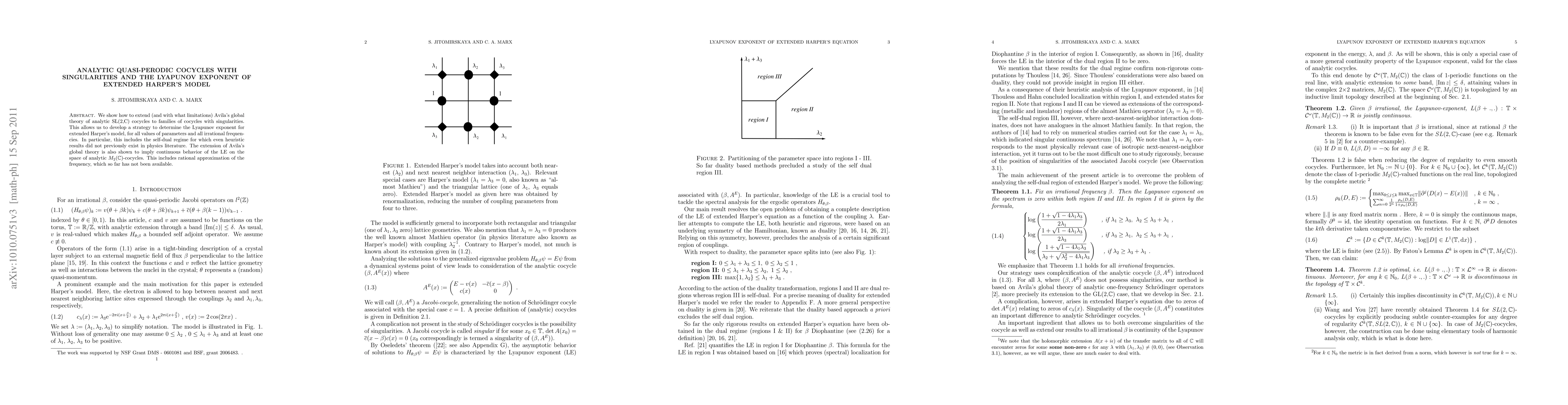 We show how to extend (and with what limitations) Avila's global theory of analytic SL(2,C) cocycles to families of cocycles with singularities. This allows us to develop a strategy to determine the Lyapunov exponent for extended Harper's model, for all values of parameters and all irrational frequencies. In particular, this includes the self-dual regime for which even heuristic results did not previously exist in physics literature. The extension of Avila's global theory is also shown to imply continuous behavior of the LE on the space of analytic $M_2(\mathbb{C})$-cocycles. This includes rational approximation of the frequency, which so far has not been available.
