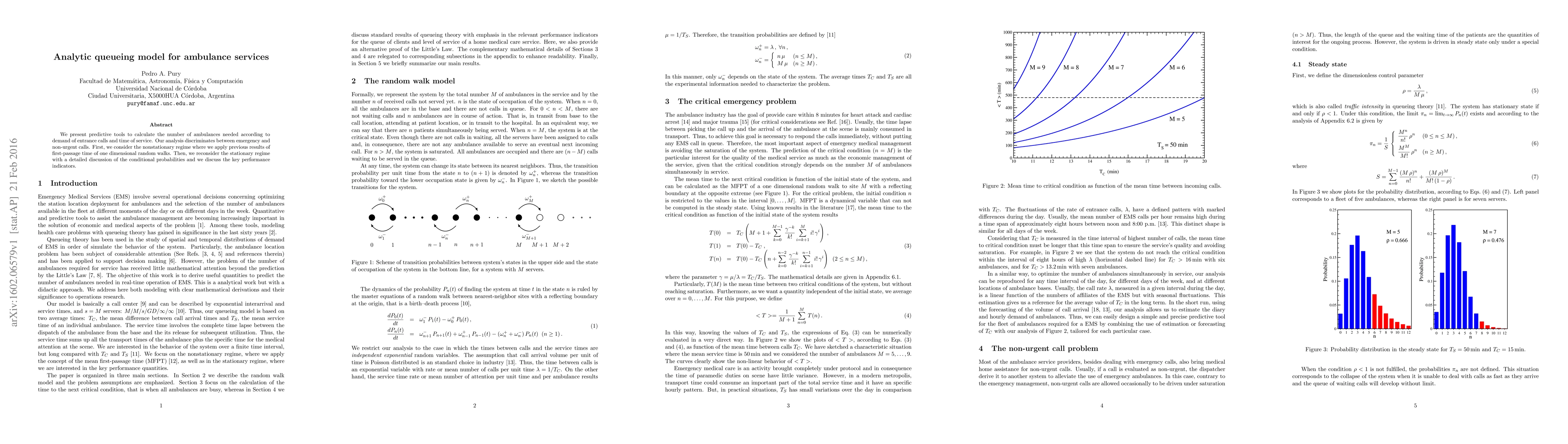 We present predictive tools to calculate the number of ambulances needed according to demand of entrance calls and time of service. Our analysis discriminates between emergency and non-urgent calls. First, we consider the nonstationary regime where we apply previous results of first-passage time of one dimensional random walks. Then, we reconsider the stationary regime with a detailed discussion of the conditional probabilities and we discuss the key performance indicators.