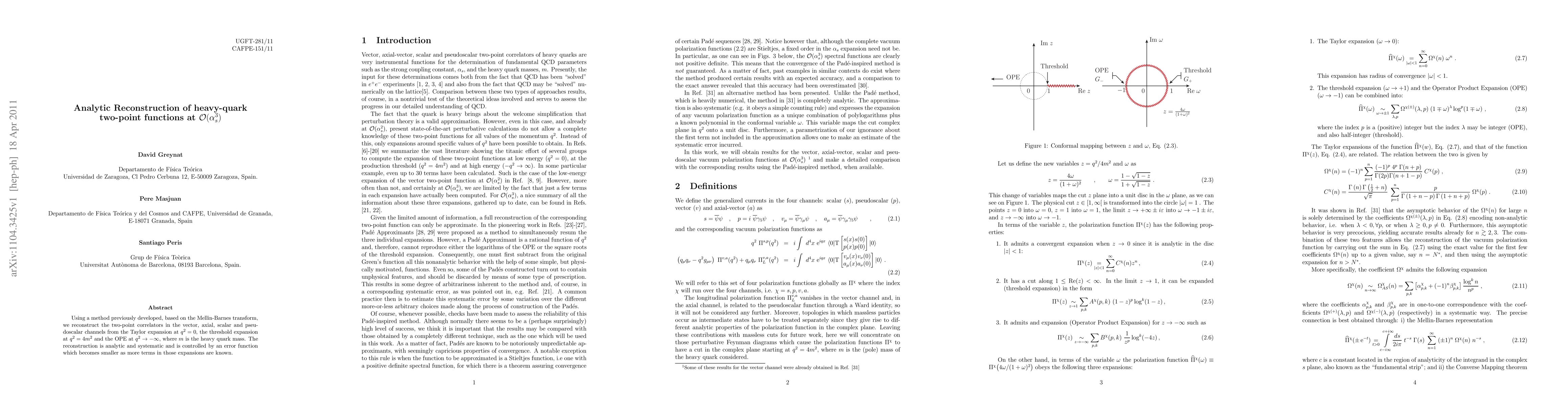 This paper reconstructs heavy-quark two-point functions at the O(α_s^3) level using a Mellin-Barnes transform method. The analysis covers vector, axial, scalar, and pseudoscalar channels, employing expansions at various q^2 values, and the reconstruction is systematic and controlled by an error function.
