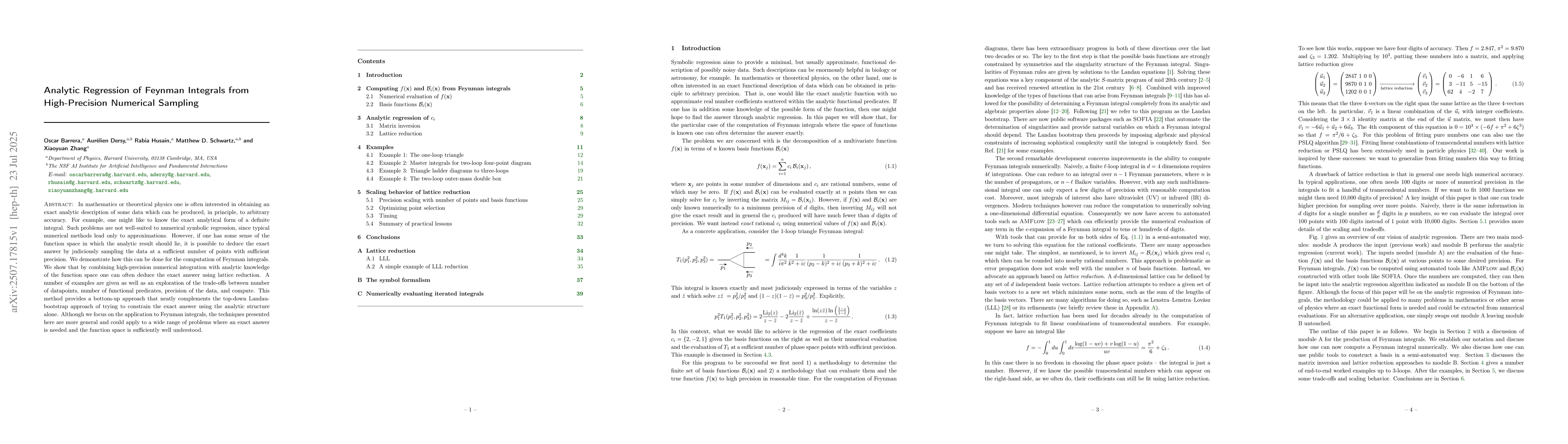 The development of a novel analytic regression technique using latticereduction, enabling the recovery of exact forms of Feynman integrals from high-precision numerical data.