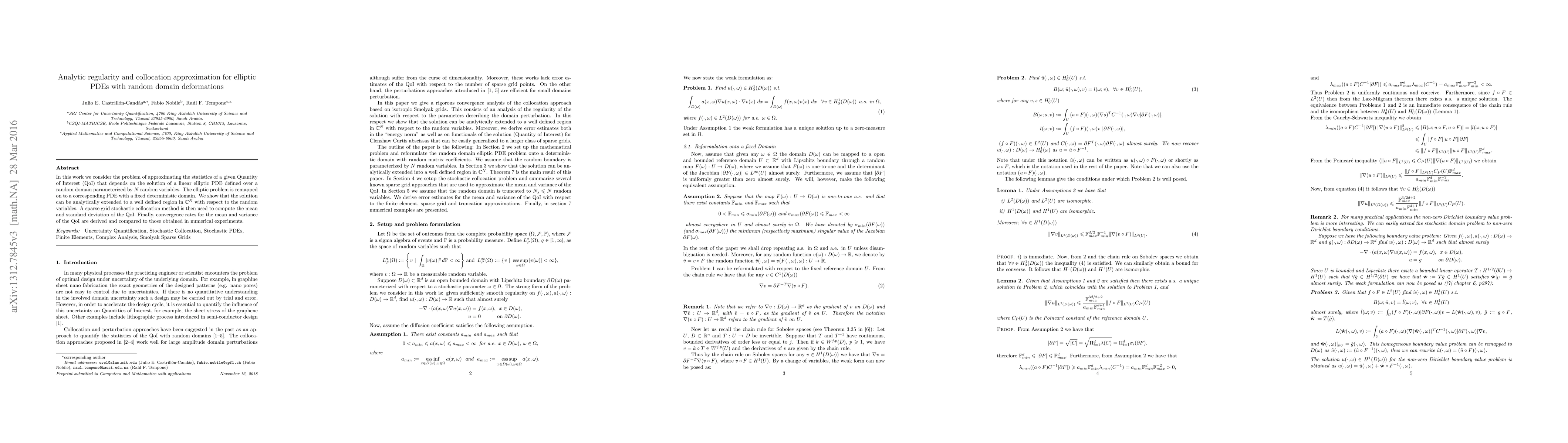 In this work we consider the problem of approximating the statistics of a given Quantity of Interest (QoI) that depends on the solution of a linear elliptic PDE defined over a random domain parameterized by $N$ random variables. The elliptic problem is remapped on to a corresponding PDE with a fixed deterministic domain. We show that the solution can be analytically extended to a well defined region in $\C^{N}$ with respect to the random variables. A sparse grid stochastic collocation method is then used to compute the mean and standard deviation of the QoI. Finally, convergence rates for the mean and variance of the QoI are derived and compared to those obtained in numerical experiments.