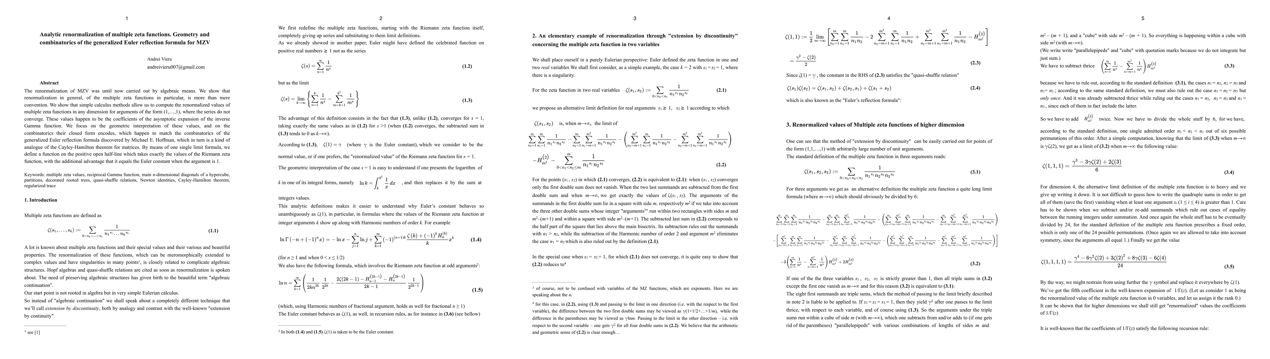 The renormalization of MZV was until now carried out by algebraic means. We show that renormalization in general, of the multiple zeta functions in particular, is more than mere convention. We show that simple calculus methods allow us to compute the renormalized values of multiple zeta functions in any dimension for arguments of the form (1,...,1), where the series do not converge. These values happen to be the coefficients of the asymptotic expansion of the inverse Gamma function. We focus on the geometric interpretation of these values, and on the combinatorics their closed form encodes, which happen to match the combinatorics of the generalized Euler reflection formula discovered by Michael E. Hoffman, which in turn is a kind of analogue of the Cayley-Hamilton theorem for matrices. By means of one single limit formula, we define a function on the positive open half-line which takes exactly the values of the Riemann zeta function, with the additional advantage that it equals the Euler constant when the argument is 1.