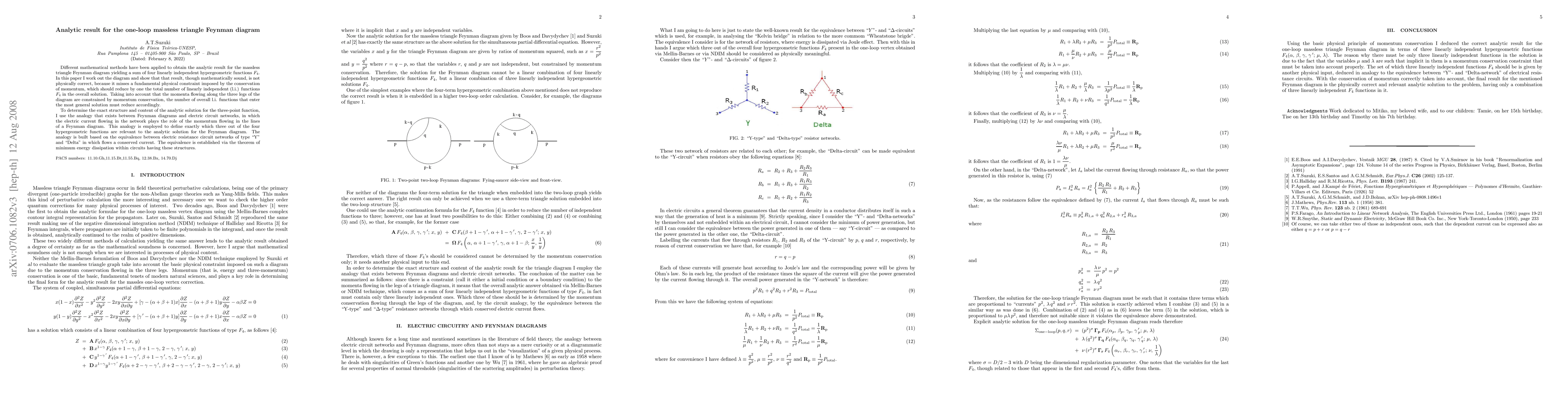 This paper derives the analytic result for the one-loop massless triangle Feynman diagram, revealing that it comprises four linearly independent hypergeometric functions. However, it argues that the result is physically incorrect due to the missing momentum conservation constraint, which should reduce the number of independent functions to three. The author uses the analogy between Feynman diagrams and electric circuit networks to determine the correct three functions that respect the momentum conservation law.