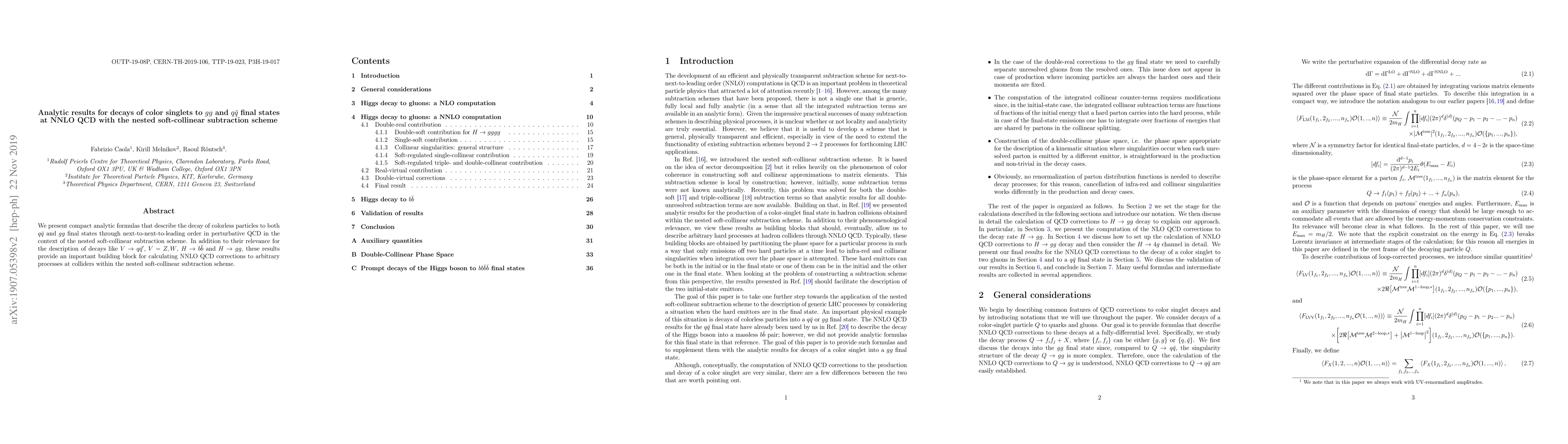 This paper provides analytic formulas for the decay of color singlets to $q \bar q$ and $gg$ final states at next-to-next-to-leading order in QCD using the nested soft-collinear subtraction scheme. These results are crucial for describing decays of particles like $V \to q \bar q'$ and $H \to b \bar b$ or $H \to gg$, and serve as a foundation for NNLO QCD calculations in collider physics.