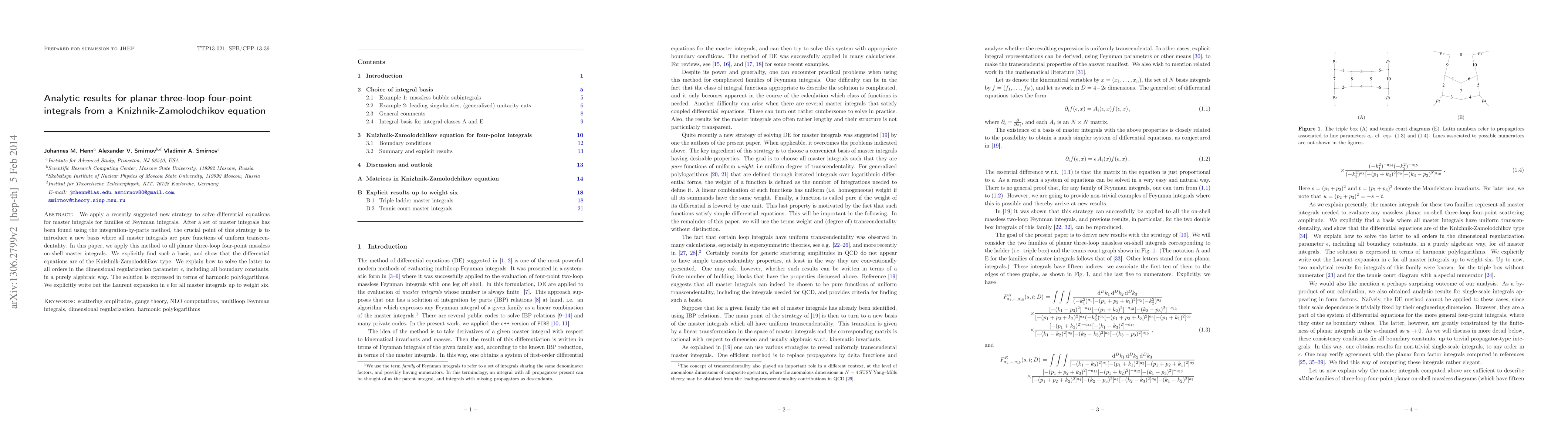 This paper applies a novel strategy to solve differential equations for planar three-loop four-point integrals by transforming them into Knizhnik-Zamolodchikov type equations. The method finds a basis where master integrals are pure functions, and solves these equations algebraically to express solutions in terms of harmonic polylogarithms.