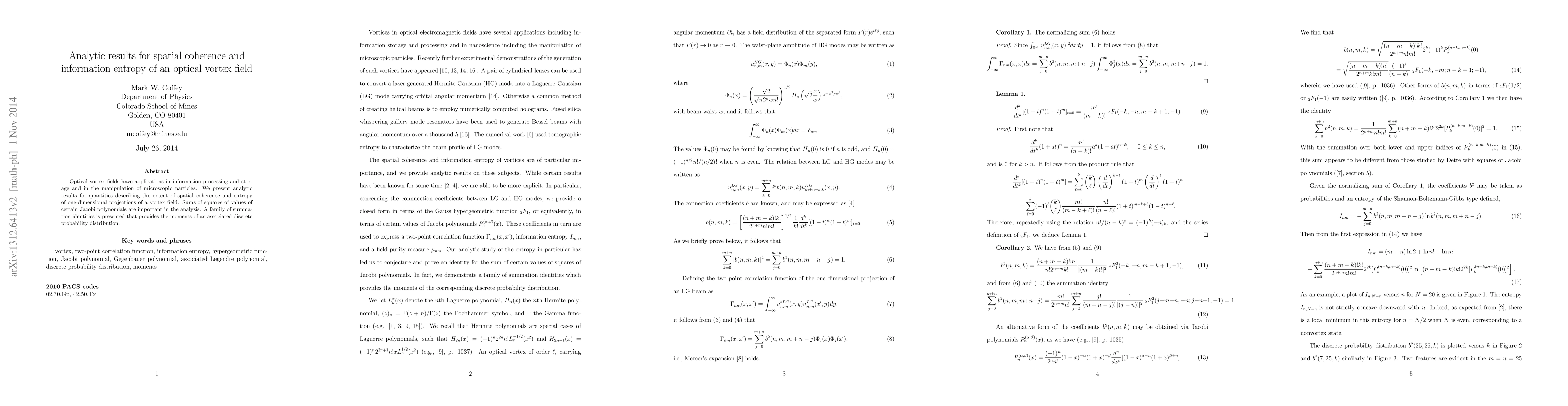 The paper presents analytic results on spatial coherence and information entropy of optical vortex fields, using Jacobi polynomials to analyze the field's behavior.