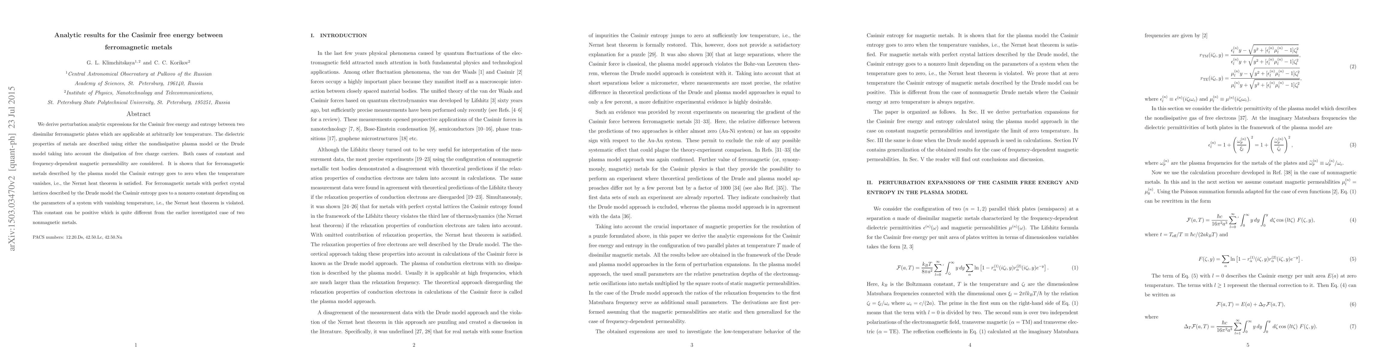 This paper derives perturbation analytic expressions for the Casimir free energy and entropy between ferromagnetic metals, considering both plasma and Drude models. It finds that the Nernst heat theorem holds for plasma-model metals but is violated for Drude-model metals, which exhibit a nonzero constant Casimir entropy at zero temperature.