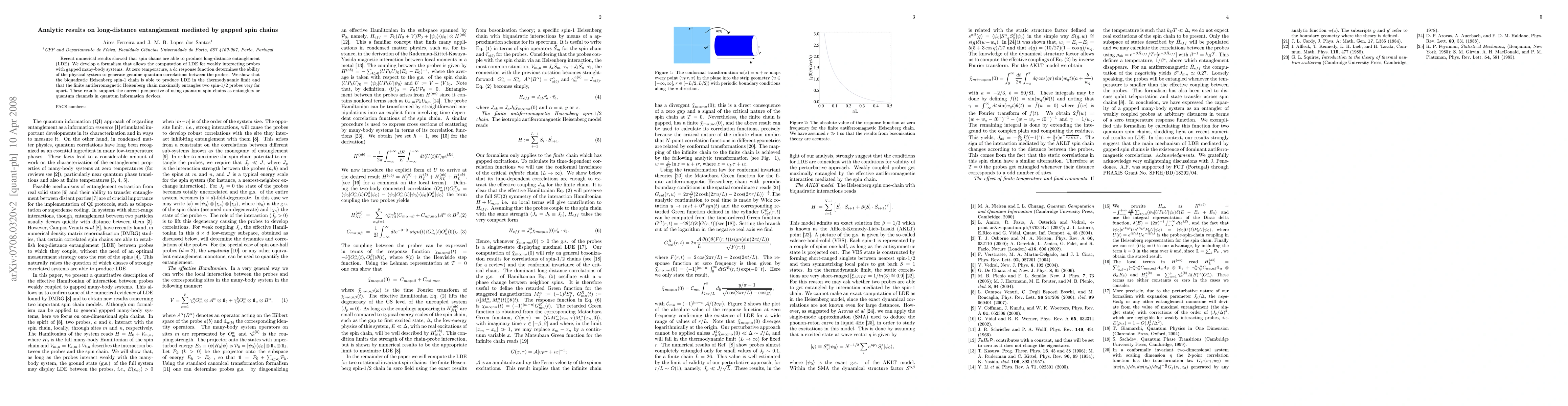 We give an analytical description of long distance entanglement (LDE) mediated by one-dimensional quantum spin chains recently found in numerical studies. We develop a formalism that allows the computation of LDE for weakly interacting probes with gapped many-body systems. At zero temperature, a DC response function determines the ability of the physical system to generate genuine quantum correlations between the probes. We show that the biquadratic Heisenberg spin-1 chain is able to produce LDE in the thermodynamical limit and that the finite antiferromagnetic Heisenberg chain maximally entangles two spin-1/2 probes very far apart. These results support the current perspective of using quantum spin chains as entanglers or quantum channels in quantum information devices.