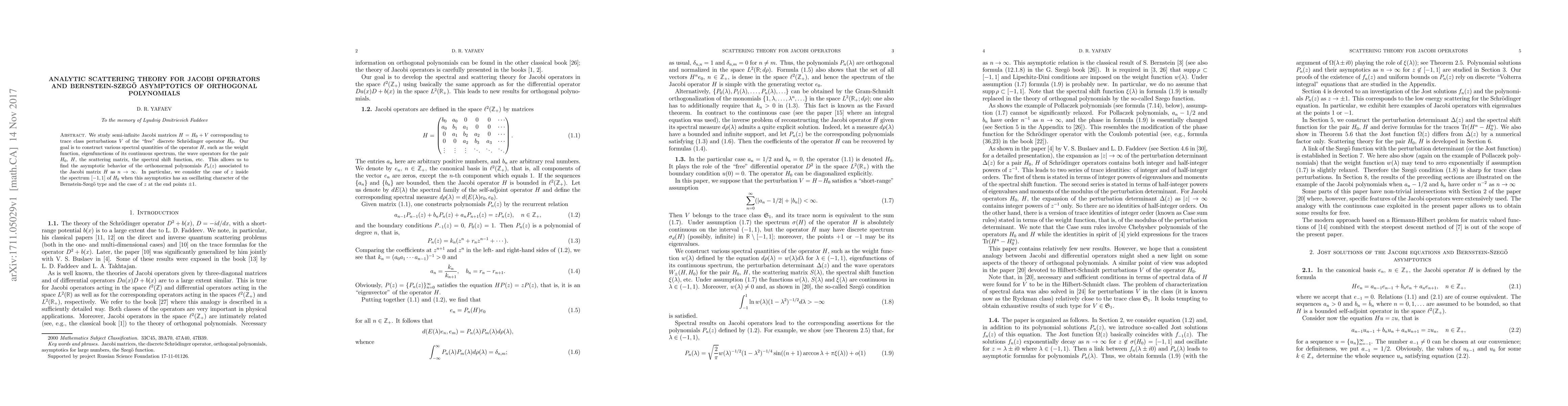 This paper develops an analytic scattering theory for semi-infinite Jacobi matrices, enabling the analysis of asymptotic behavior of orthonormal polynomials associated with these operators.