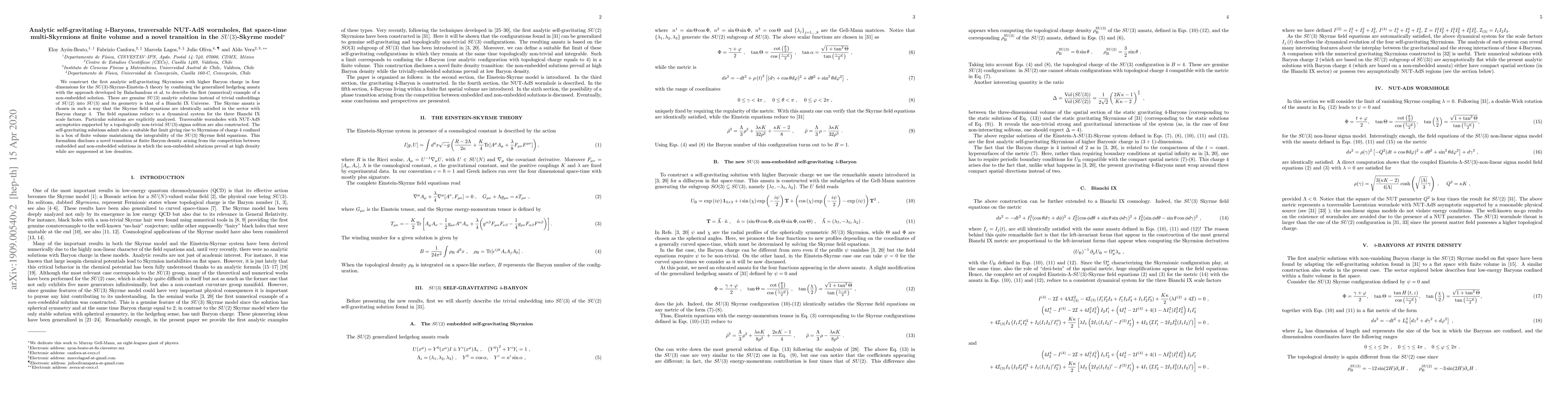 This paper constructs the first analytic self-gravitating Skyrmions with four baryon charges in four-dimensional $SU(3)$-Skyrme-Einstein-$\Lambda$ theory, revealing a novel transition in the model where non-embedded solutions dominate at high baryon densities. It also presents traversable wormholes and finite-volume Skyrmions.