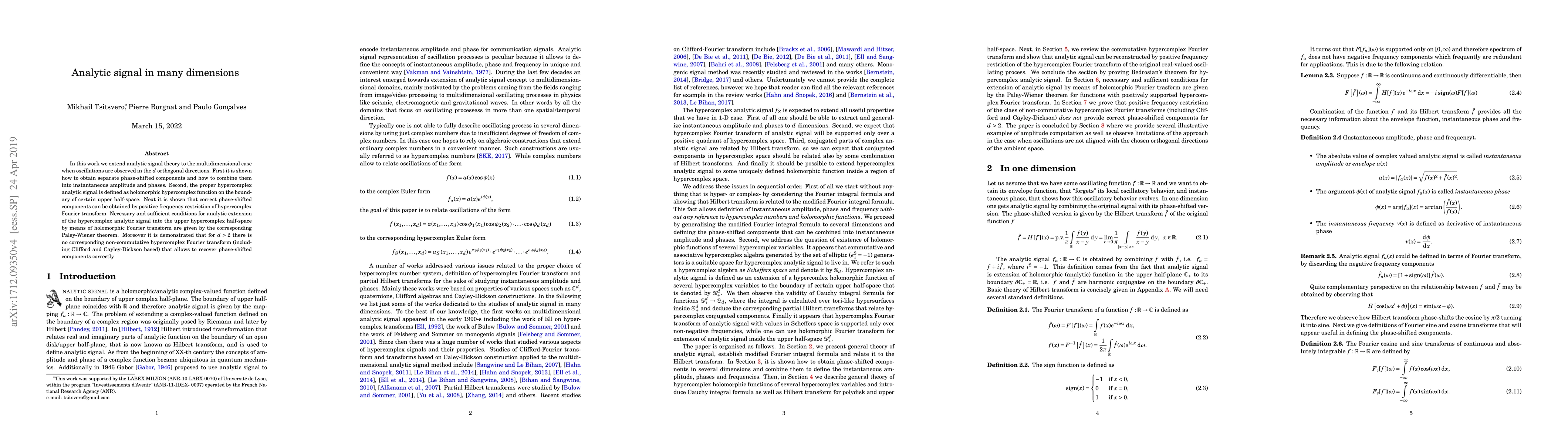 This paper extends analytic signal theory to multidimensional oscillations, defining a hypercomplex analytic signal and demonstrating its properties. It shows the necessity of a holomorphic Fourier transform for correct phase-shifted component recovery, while highlighting the absence of a non-commutative hypercomplex Fourier transform for dimensions greater than two.