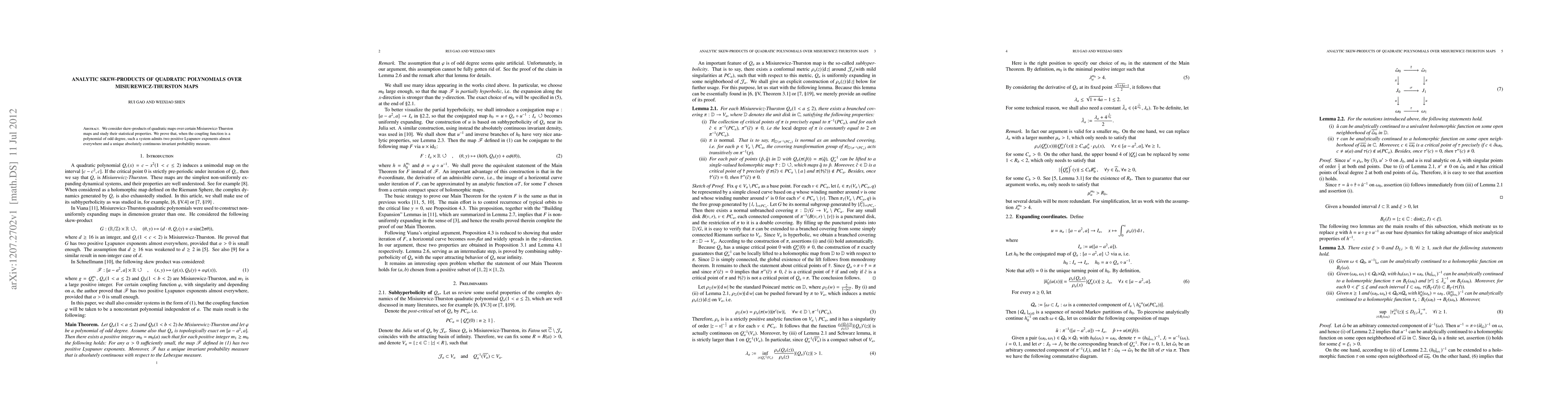 Summary: This research investigates skew-products of quadratic polynomials over Misiurewicz-Thurston maps, proving the existence of two positive Lyapunov exponents and a unique absolutely continuous invariant measure when the coupling function is an odd-degree polynomial.