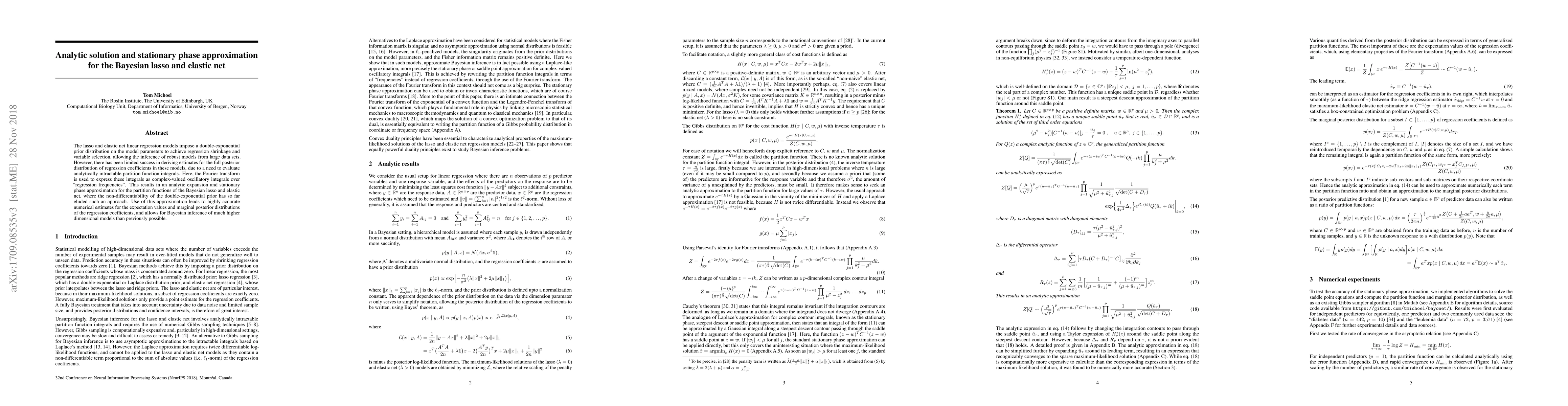 This paper develops an analytic solution and stationary phase approximation for the Bayesian lasso and elastic net, using Fourier transforms to handle intractable partition functions. This approach enables accurate numerical estimates for regression coefficients and facilitates Bayesian inference in higher dimensional models.