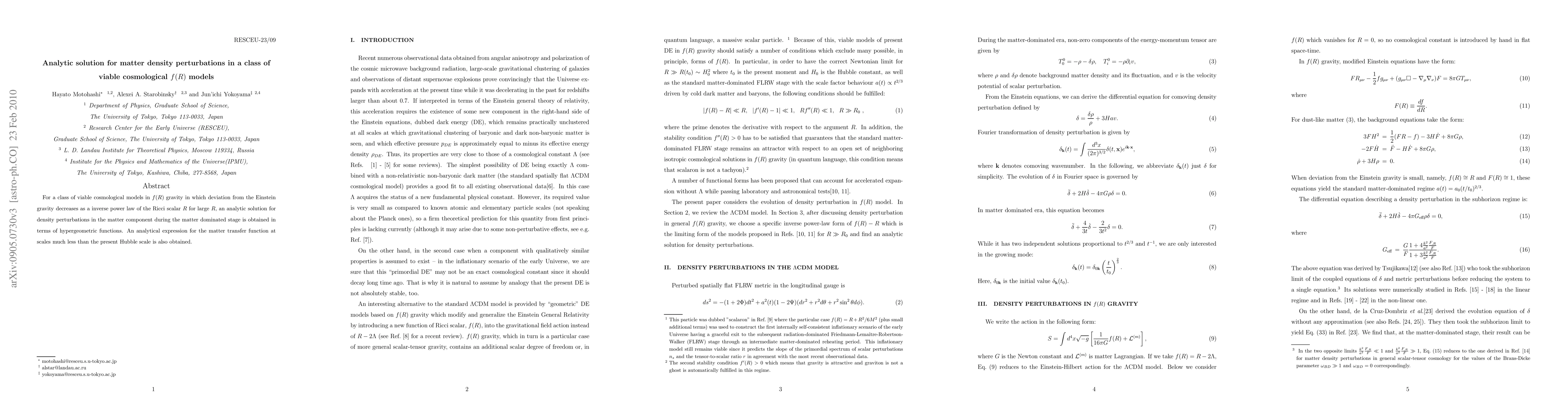 For a class of viable cosmological models in $f(R)$ gravity which deviation from the Einstein gravity decreases as a inverse power law of the Ricci scalar $R$ for large $R$, an analytic solution for density perturbations in the matter component during the matter dominated stage is obtained in terms of hypergeometric functions. An analytical expression for the matter transfer function at scales much less than the present Hubble scale is also obtained.