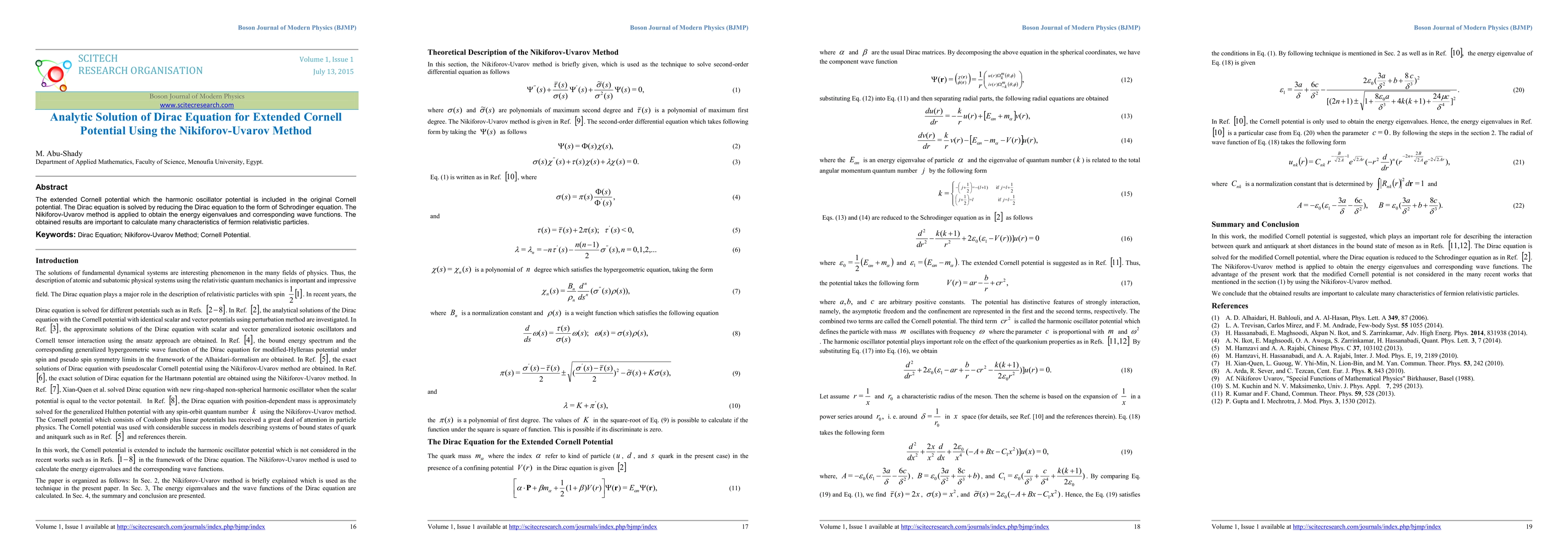 This paper presents an analytic solution for the Dirac equation under an extended Cornell potential using the Nikiforov-Uvarov method, transforming the Dirac equation into a Schrödinger-like form to obtain energy eigenvalues and wave functions. The results are crucial for understanding the properties of relativistic fermions.