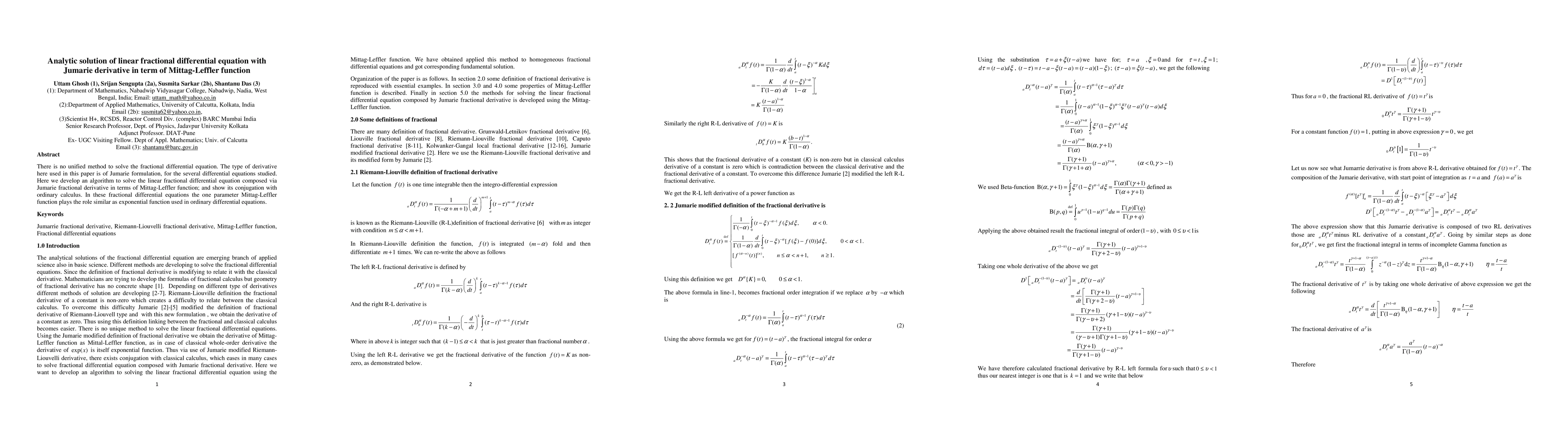 This paper develops an analytic solution for linear fractional differential equations using Jumarie derivatives, expressing the solution in terms of the Mittag-Leffler function. The study demonstrates the equivalence of the Mittag-Leffler function to the exponential function in ordinary calculus.