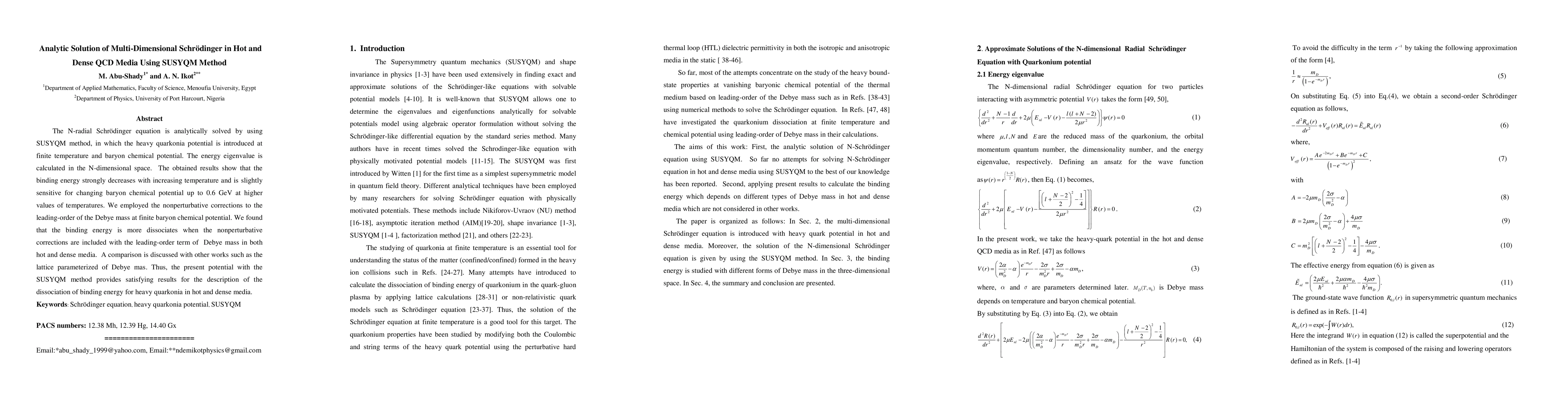 The N-radial Schr\"odinger equation is analytically solved by using SUSYQM method, in which the heavy quarkonia potential is introduced at finite temperature and baryon chemical potential. The energy eigenvalue is calculated in the N-dimensional space. The obtained results show that the binding energy strongly decreases with increasing temperature and is slightly sensitive for changing baryon chemical potential up to 0.6 GeV at higher values of temperatures. We employed the nonperturbative corrections to the leading-order of the Debye mass at finite baryon chemical potential. We found that the binding energy is more dissociates when the nonperturbative corrections are included with the leading-order term of Debye mass in both hot and dense media. A comparison is discussed with other works such as the lattice parameterized of Debye mas. Thus, the present potential with the SUSYQM method provides satisfying results for the description of the dissociation of binding energy for heavy quarkonia in hot and dense media.