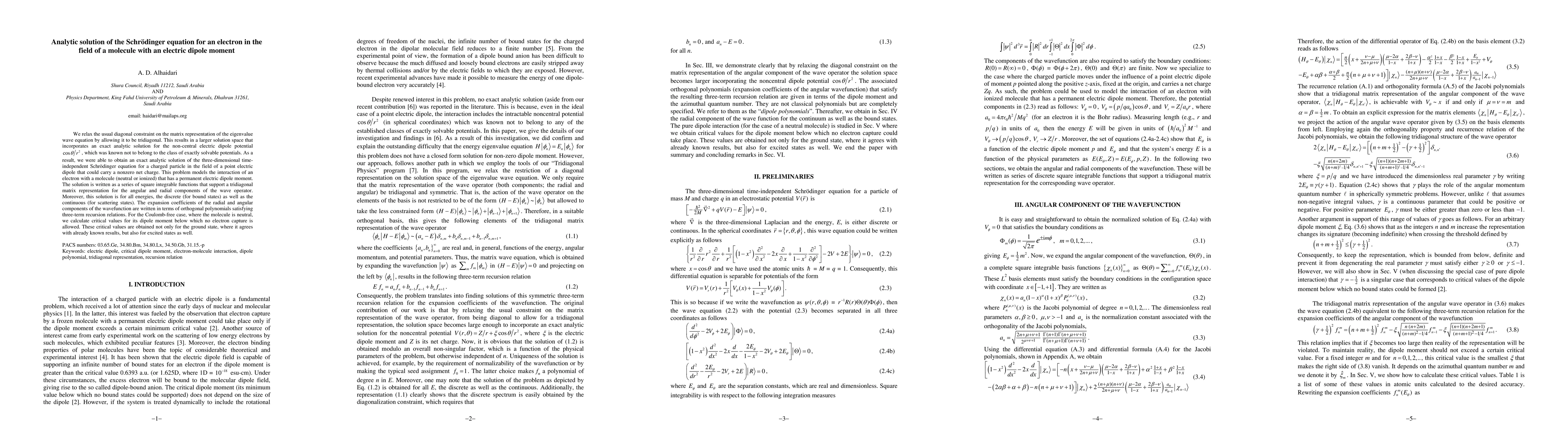 We relax the usual diagonal constraint on the matrix representation of the eigenvalue wave equation by allowing it to be tridiagonal. This results in a larger solution space that incorporates an exact analytic solution for the non-central electric dipole potential cos(theta)/r^2, which was known not to belong to the class of exactly solvable potentials. As a result, we were able to obtain an exact analytic solution of the three-dimensional time-independent Schrodinger equation for a charged particle in the field of a point electric dipole that could carry a nonzero net charge. This problem models the interaction of an electron with a molecule (neutral or ionized) that has a permanent electric dipole moment. The solution is written as a series of square integrable functions that support a tridiagonal matrix representation for the angular and radial components of the wave operator. Moreover, this solution is for all energies, the discrete (for bound states) as well as the continuous (for scattering states). The expansion coefficients of the radial and angular components of the wavefunction are written in terms of orthogonal polynomials satisfying three-term recursion relations. For the Coulomb-free case, where the molecule is neutral, we calculate critical values for its dipole moment below which no electron capture is allowed. These critical values are obtained not only for the ground state, where it agrees with already known results, but also for excited states as well.