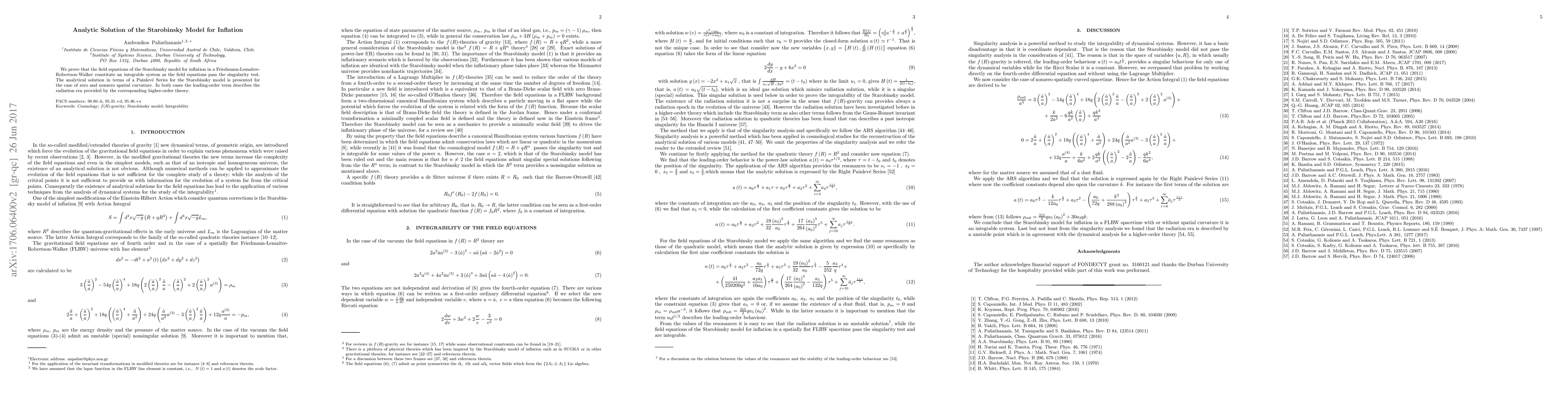 We prove that the field equations of the Starobinsky model for inflation in a Friedmann-Lema\^{\i}tre-Robertson-Walker constitute an integrable system as the field equations pass the singularity test. The analytical solution in terms of a Painlev\'{e} Series for the Starobinsky model is presented for the case of zero and nonzero spatial curvature. In both cases the leading-order term describes the radiation era provided by the corresponding higher-order theory.