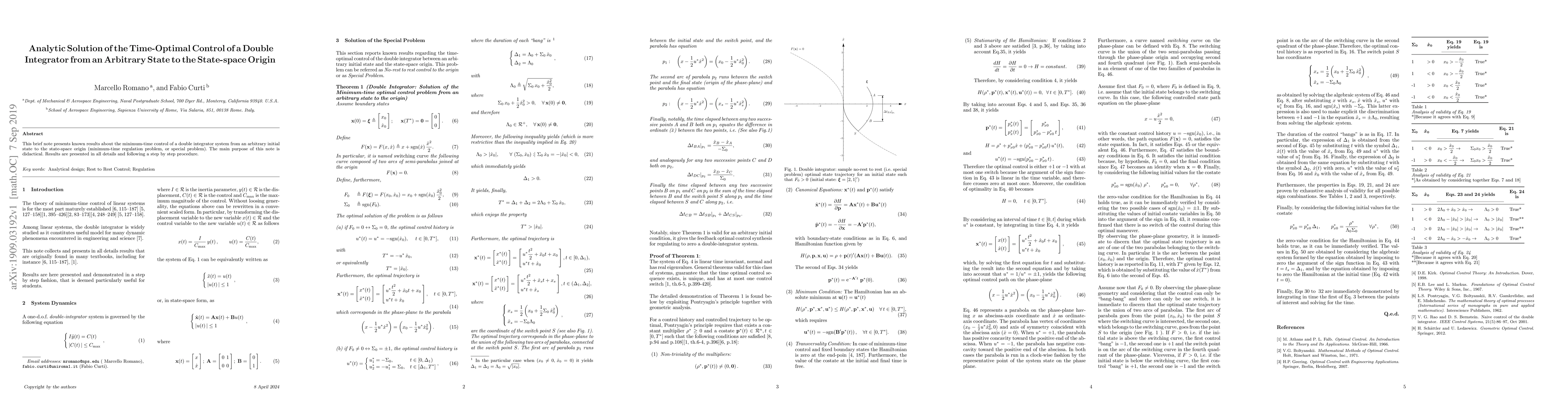 This brief note presents known results about the minimum-time control of a double integrator system from an arbitrary initial state to the state-space origin (minimum-time regulation problem, or special problem). The main purpose of this note is didactical. Results are presented in all details and following a step by step procedure.