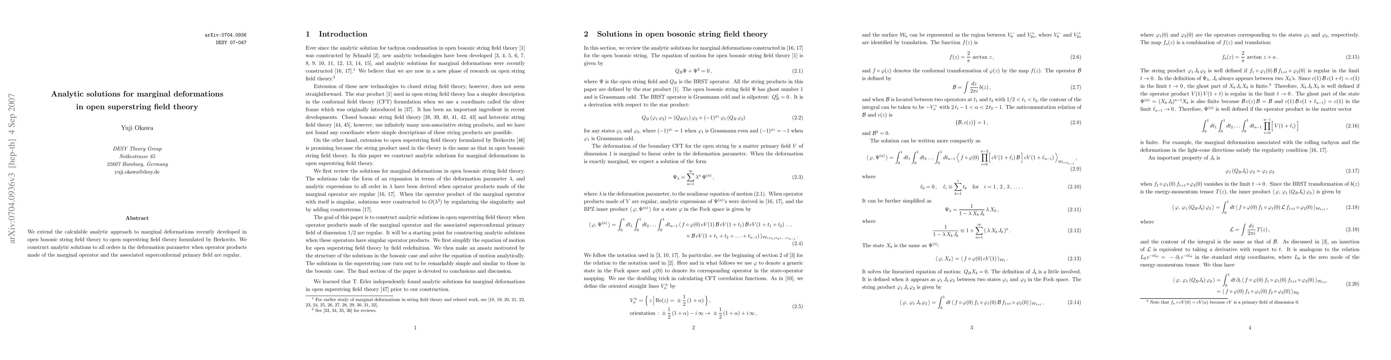 This paper extends the analytic method for marginal deformations from bosonic to superstring field theory, providing solutions at all orders in the deformation parameter under conditions of regularity in operator products involving a marginal operator and a superconformal primary field.