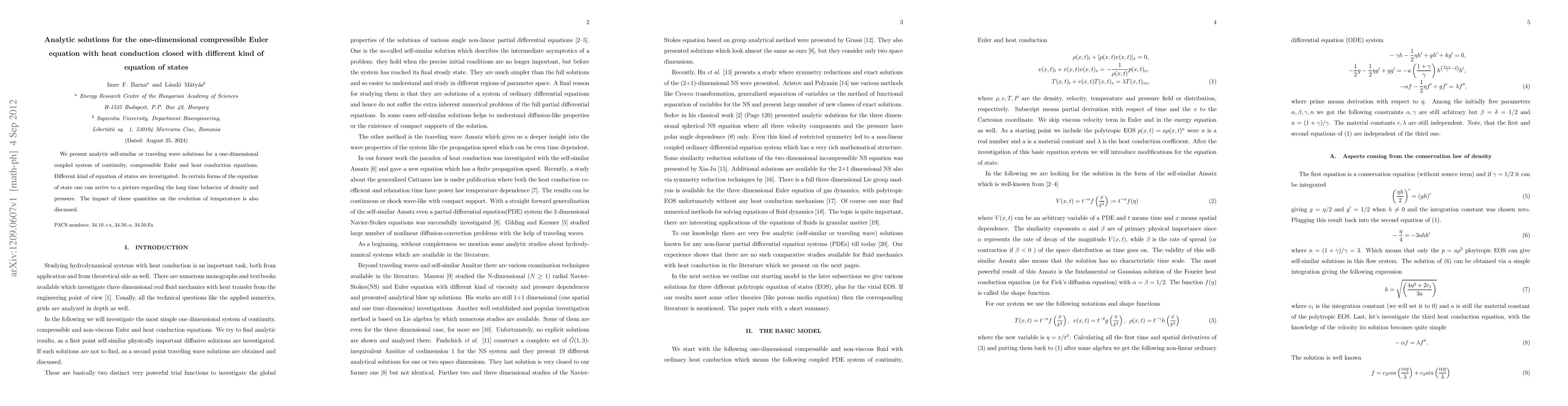 This paper provides analytic solutions for the one-dimensional compressible Euler equation with heat conduction, exploring self-similar or traveling wave forms. It examines various equations of state to understand the long-term behavior of density and pressure, and discusses their influence on temperature evolution.