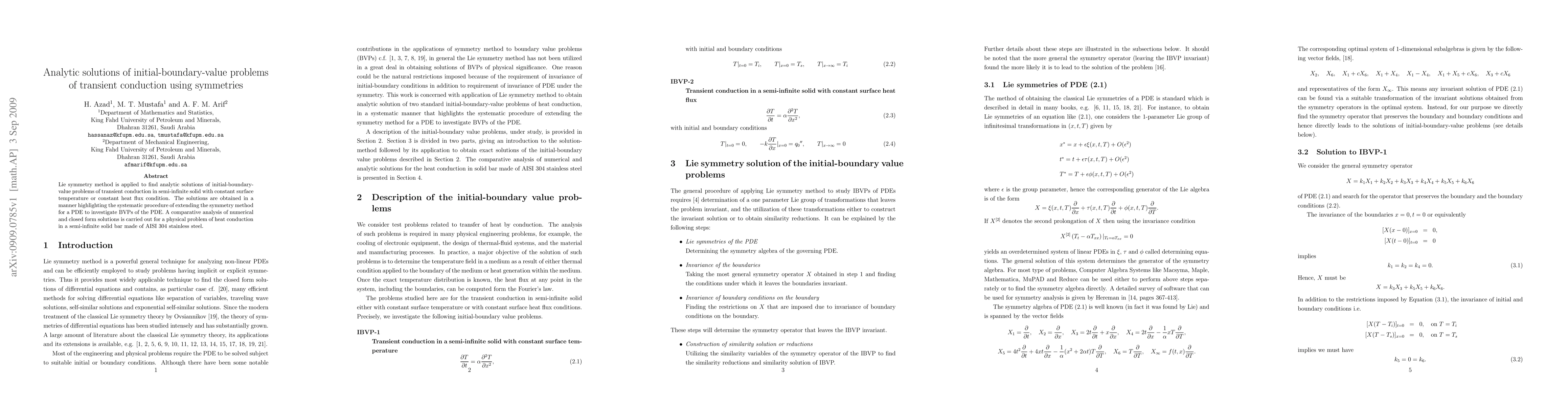 This paper applies the Lie symmetry method to derive analytic solutions for transient conduction problems in semi-infinite solids under constant surface temperature or heat flux conditions. Comparative analysis between numerical and closed-form solutions is performed for a specific heat conduction problem in an AISI 304 stainless steel bar.