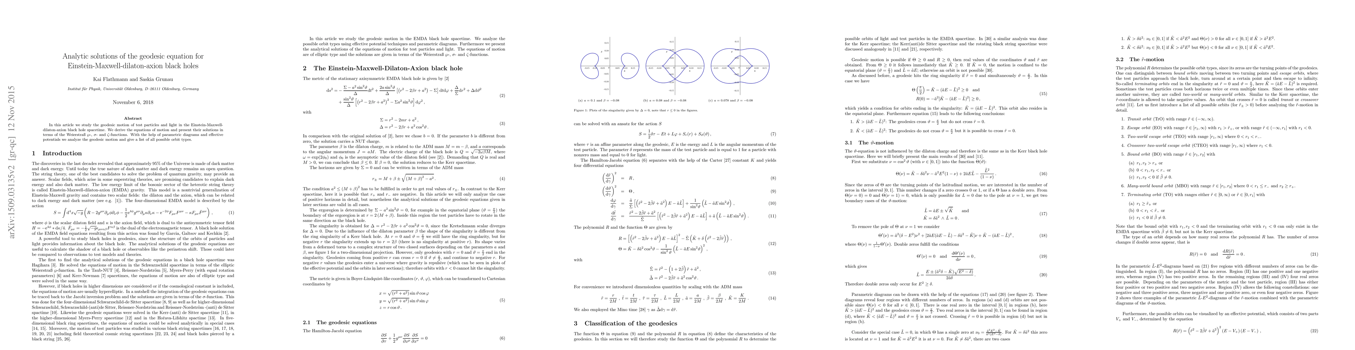 This paper derives analytic solutions for geodesic equations in the Einstein-Maxwell-Dilaton-Axion black hole spacetime, employing Weierstra{\ss} $\wp$-, $\sigma$- and $\zeta$-functions, and analyzes various orbit types using parametric diagrams and effective potentials.