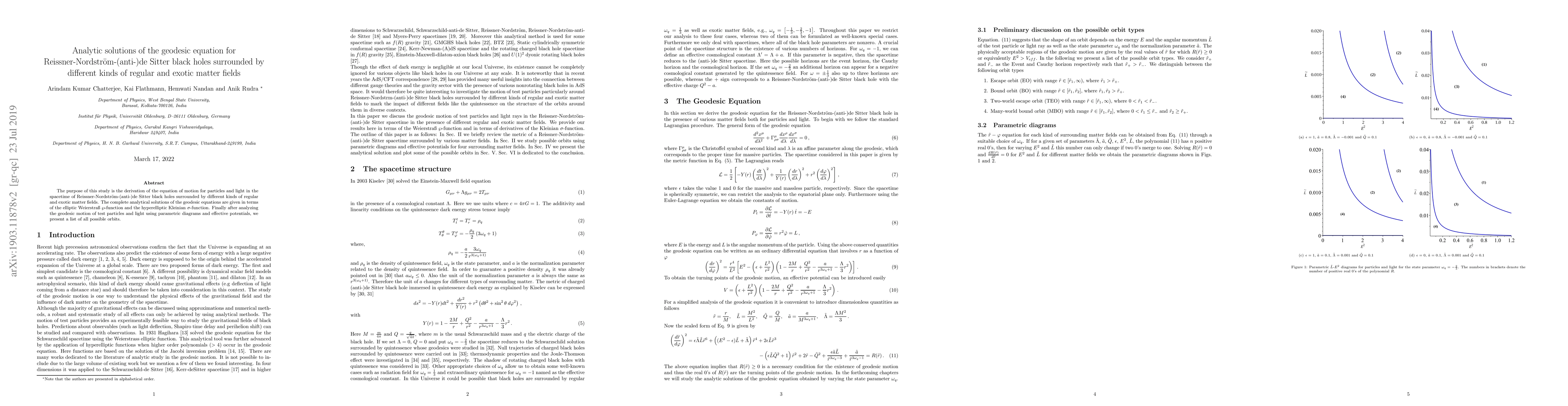 This study derives analytical solutions for geodesic equations in Reissner-Nordstr"om black holes with various matter fields, revealing possible orbits of test particles and light.