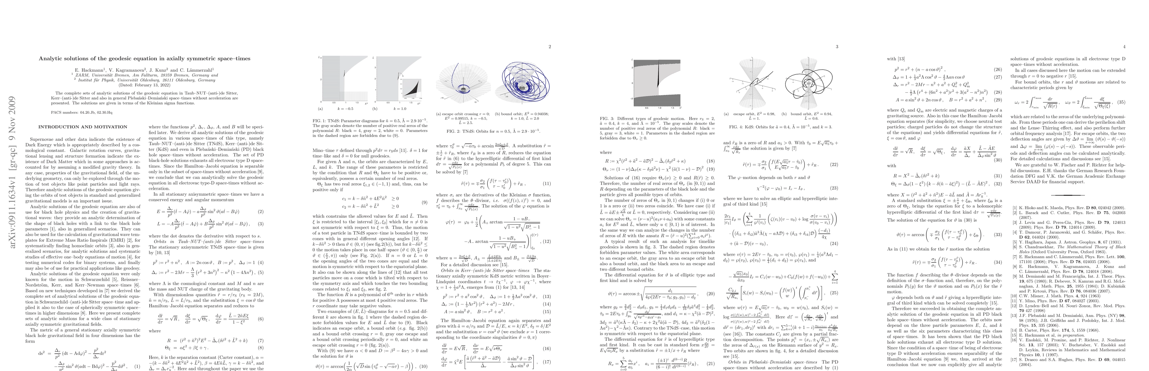 This paper presents complete analytic solutions for the geodesic equation in several axially symmetric space-times, including Taub-NUT-(anti-)de Sitter, Kerr-(anti-)de Sitter, and general Plebanski-Demianski space-times, expressed using Kleinian sigma functions.