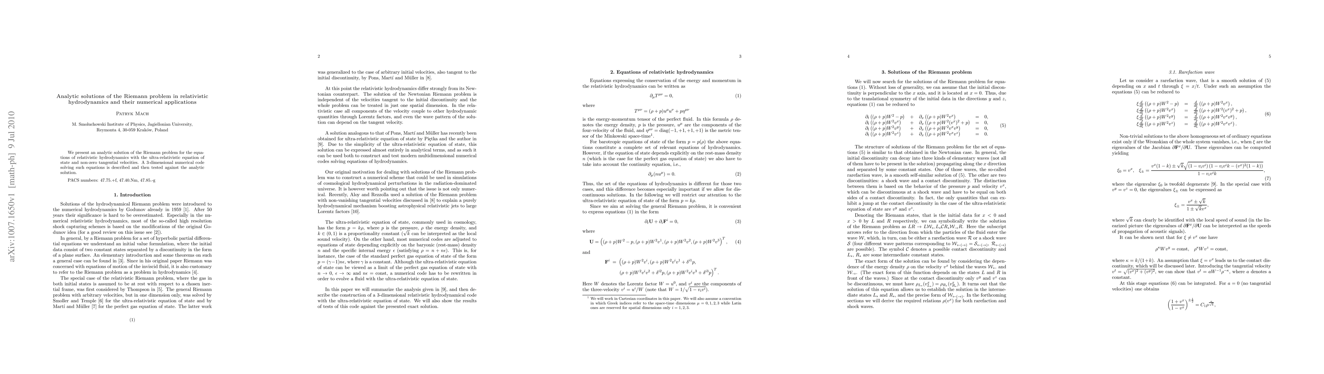 This paper provides an analytic solution for the Riemann problem in relativistic hydrodynamics, considering ultra-relativistic conditions and tangential velocities. It also describes a 3D numerical code that is validated against the derived analytic solution.