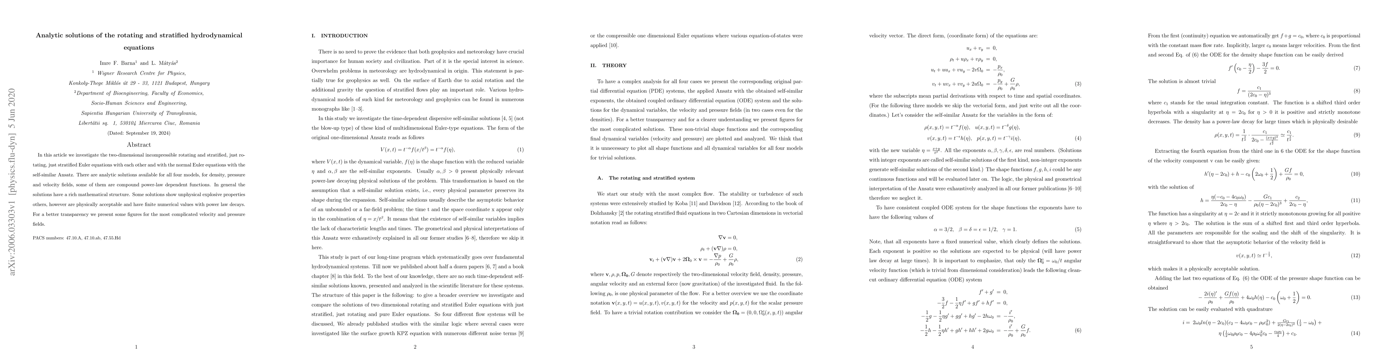 This paper presents analytic solutions to rotating and stratified hydrodynamical equations, finding physically acceptable power-law decays with finite numerical values for some models, while others exhibit explosive properties.