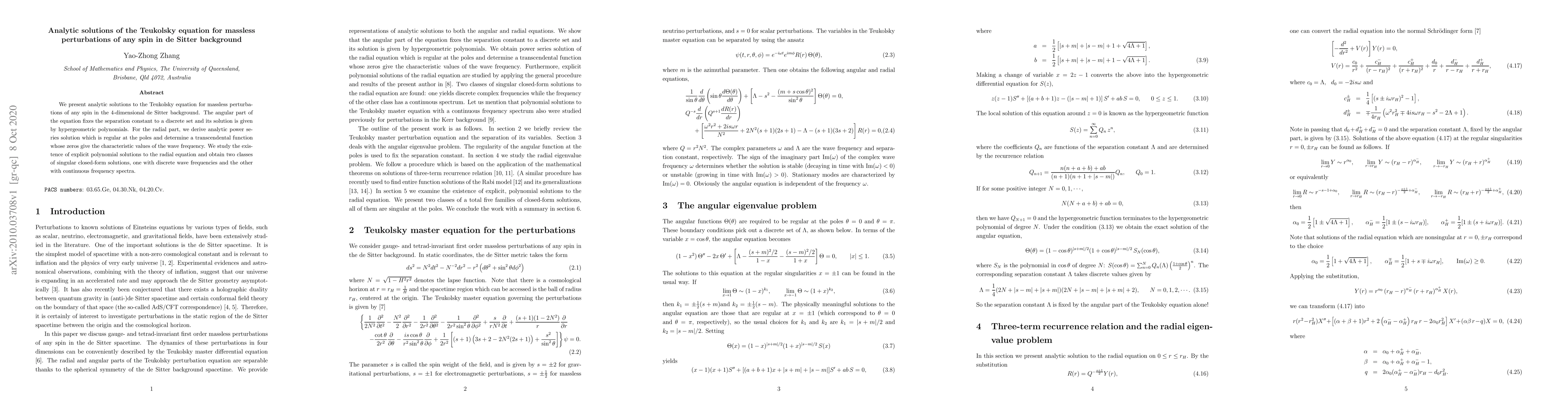 The paper provides analytic solutions to the Teukolsky equation for massless perturbations of any spin in de Sitter background, offering discrete and continuous wave frequency spectra.