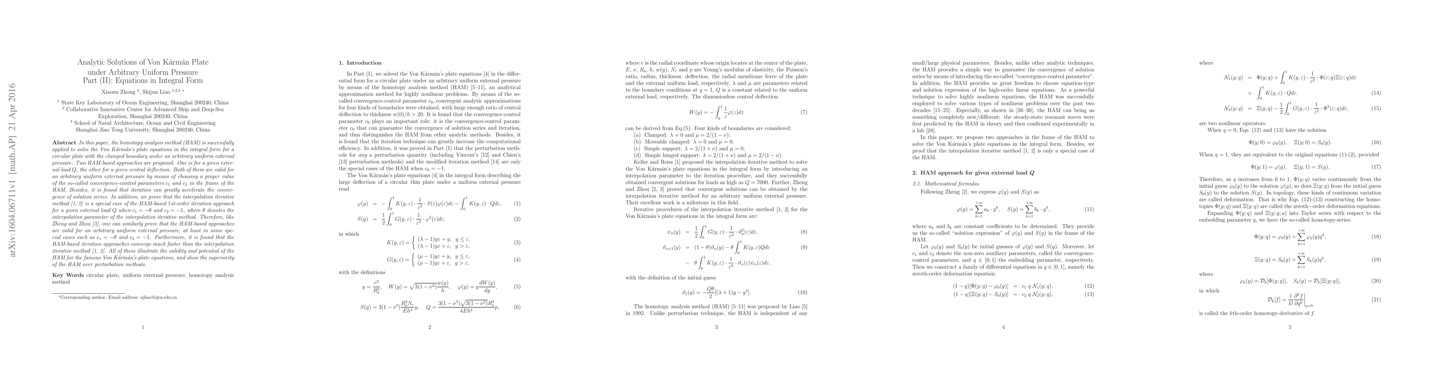 This paper applies the homotopy analysis method (HAM) to solve Von Karman's plate equations in integral form for a clamped circular plate under arbitrary uniform pressure. Two HAM-based approaches are proposed, demonstrating faster convergence and superiority over perturbation methods.