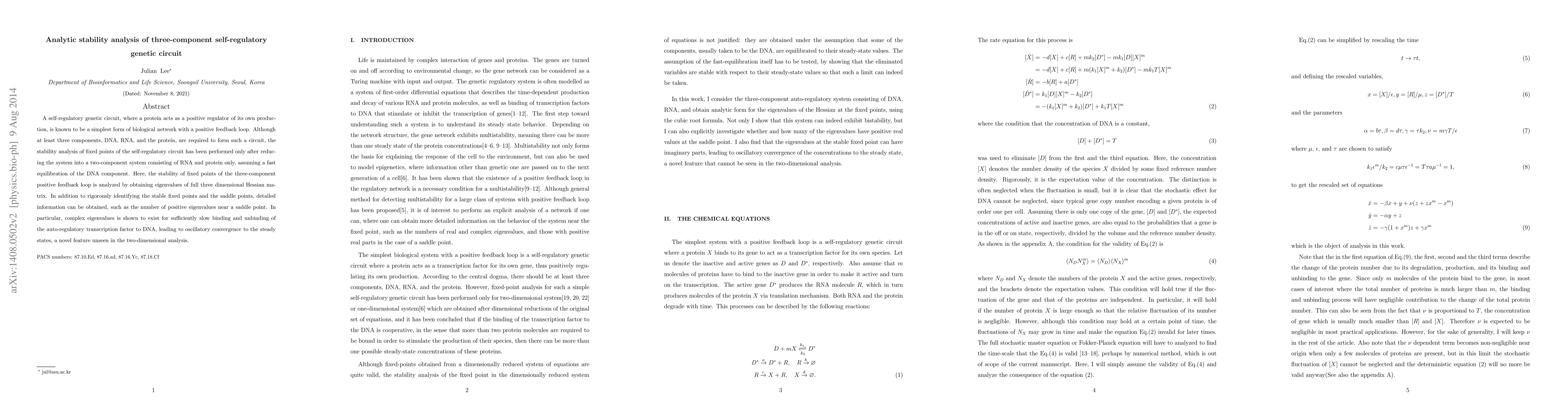 This paper conducts a stability analysis of a three-component self-regulatory genetic circuit, revealing the existence of complex eigenvalues and oscillatory convergence to steady states due to slow binding and unbinding processes, which was not observed in previous two-component analyses. The study identifies stable and saddle fixed points using the full three-dimensional Hessian matrix.