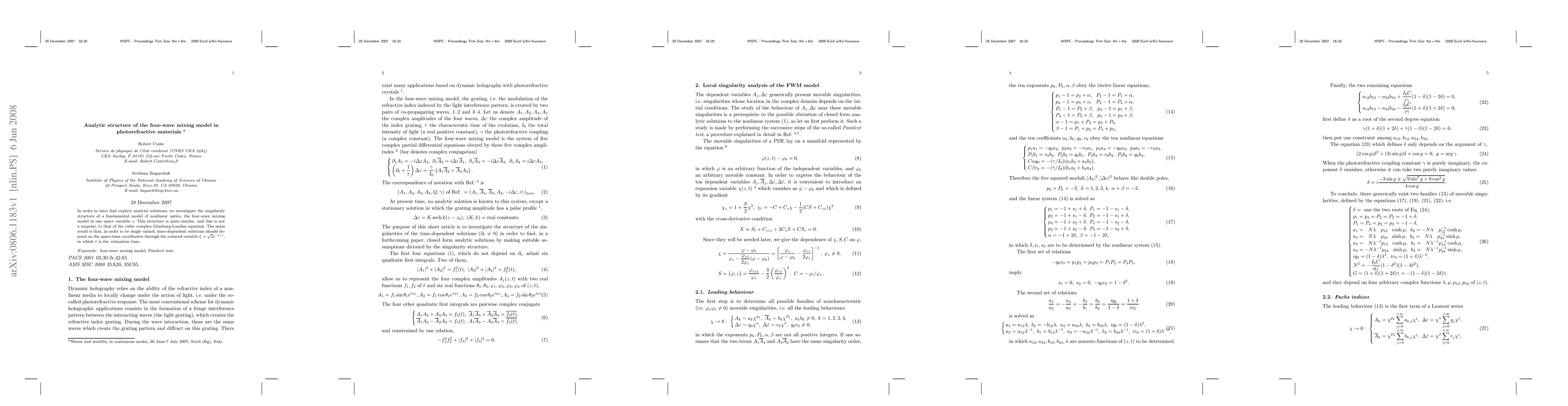 In order to later find explicit analytic solutions, we investigate the singularity structure of a fundamental model of nonlinear optics, the four-wave mixing model in one space variable z. This structure is quite similar, and this is not a surprise, to that of the cubic complex Ginzburg-Landau equation. The main result is that, in order to be single valued, time-dependent solutions should depend on the space-time coordinates through the reduced variable xi=\sqrt{z} exp(-t / tau), in which tau is the relaxation time.