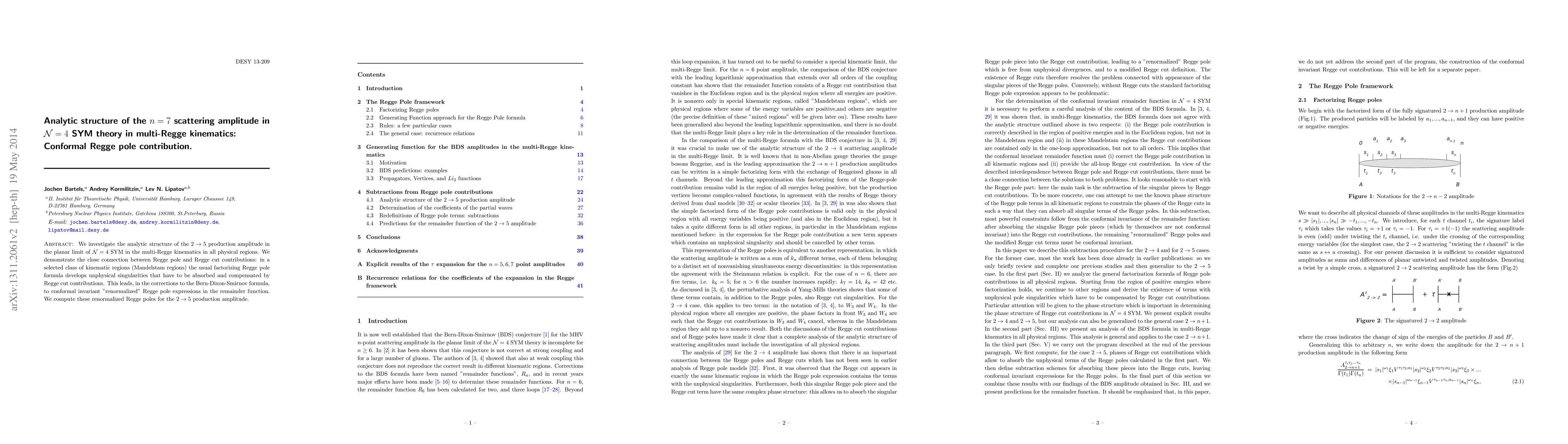 This paper studies the analytic structure of the $2\to5$ scattering amplitude in $\mathcal{N}=4$ SYM theory at multi-Regge kinematics, revealing a connection between Regge pole and Regge cut contributions. It finds conformal invariant 'renormalized' Regge pole expressions in the remainder function, computing these for the $2\to5$ scattering amplitude.