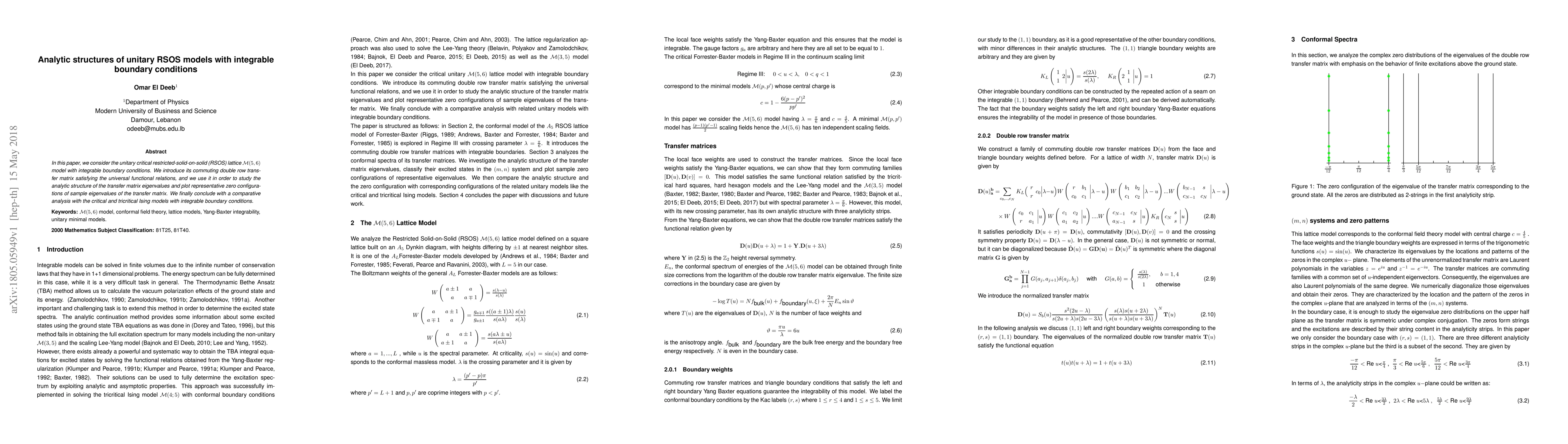 This paper analyzes the analytic structures of the $\mathcal{M}(5,6)$ unitary RSOS model with integrable boundary conditions, introducing its commuting double row transfer matrix and exploring its eigenvalue zero configurations, concluding with a comparison to critical and tricritical Ising models.