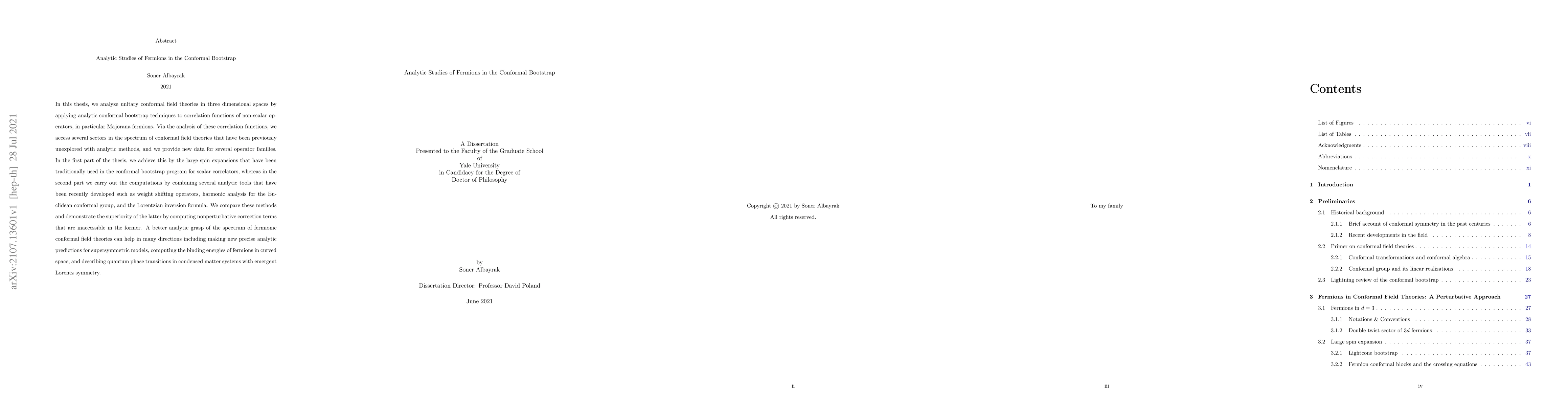 In this thesis, we analyze unitary conformal field theories in three dimensional spaces by applying analytic conformal bootstrap techniques to correlation functions of non-scalar operators, in particular Majorana fermions. Via the analysis of these correlation functions, we access several sectors in the spectrum of conformal field theories that have been previously unexplored with analytic methods, and we provide new data for several operator families. In the first part of the thesis, we achieve this by the large spin expansions that have been traditionally used in the conformal bootstrap program for scalar correlators, whereas in the second part we carry out the computations by combining several analytic tools that have been recently developed such as weight shifting operators, harmonic analysis for the Euclidean conformal group, and the Lorentzian inversion formula. We compare these methods and demonstrate the superiority of the latter by computing nonperturbative correction terms that are inaccessible in the former. A better analytic grasp of the spectrum of fermionic conformal field theories can help in many directions including making new precise analytic predictions for supersymmetric models, computing the binding energies of fermions in curved space, and describing quantum phase transitions in condensed matter systems with emergent Lorentz symmetry.