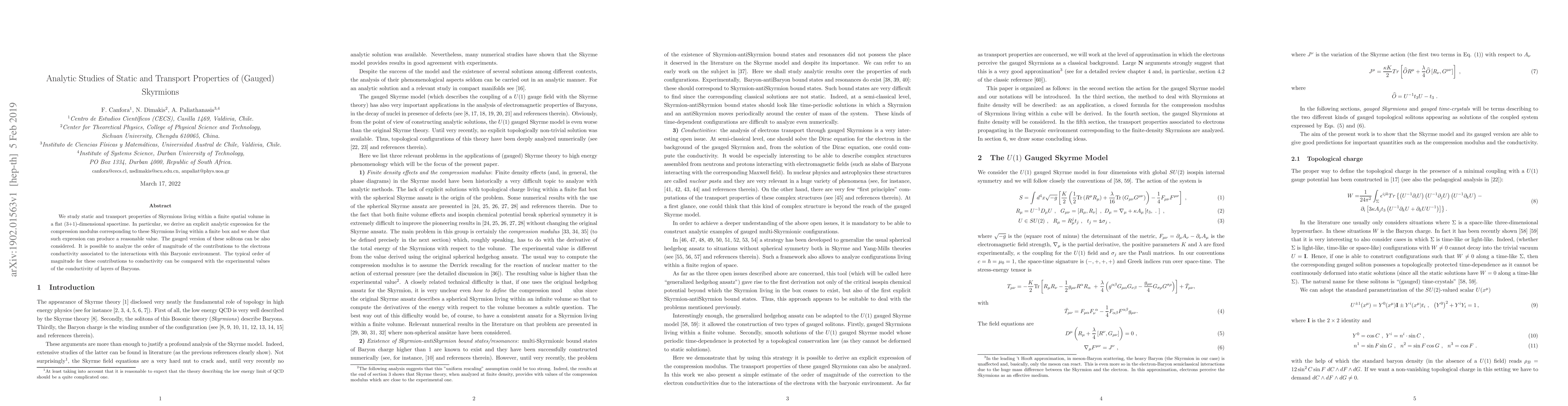 We study static and transport properties of Skyrmions living within a finite spatial volume in a flat (3+1)-dimensional spacetime. In particular, we derive an explicit analytic expression for the compression modulus corresponding to these Skyrmions living within a finite box and we show that such expression can produce a reasonable value. The gauged version of these solitons can be also considered. It is possible to analyze the order of magnitude of the contributions to the electrons conductivity associated to the interactions with this Baryonic environment. The typical order of magnitude for these contributions\ to conductivity can be compared with the experimental values of the conductivity of layers of Baryons.