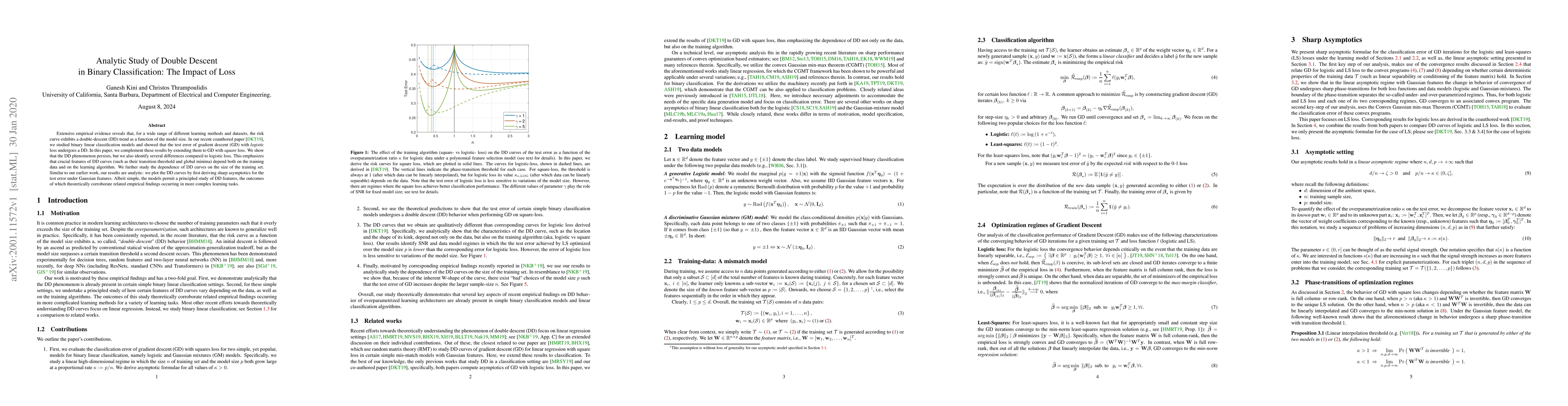 Extensive empirical evidence reveals that, for a wide range of different learning methods and datasets, the risk curve exhibits a double-descent (DD) trend as a function of the model size. In a recent paper [Zeyu,Kammoun,Thrampoulidis,2019] the authors studied binary linear classification models and showed that the test error of gradient descent (GD) with logistic loss undergoes a DD. In this paper, we complement these results by extending them to GD with square loss. We show that the DD phenomenon persists, but we also identify several differences compared to logistic loss. This emphasizes that crucial features of DD curves (such as their transition threshold and global minima) depend both on the training data and on the learning algorithm. We further study the dependence of DD curves on the size of the training set. Similar to our earlier work, our results are analytic: we plot the DD curves by first deriving sharp asymptotics for the test error under Gaussian features. Albeit simple, the models permit a principled study of DD features, the outcomes of which theoretically corroborate related empirical findings occurring in more complex learning tasks.