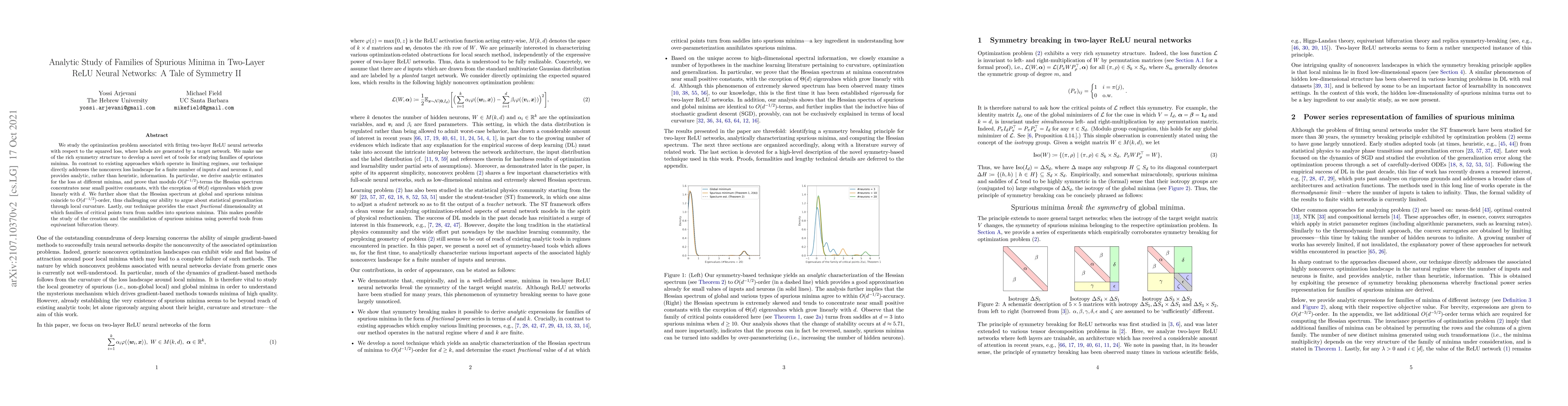 We study the optimization problem associated with fitting two-layer ReLU neural networks with respect to the squared loss, where labels are generated by a target network. We make use of the rich symmetry structure to develop a novel set of tools for studying families of spurious minima. In contrast to existing approaches which operate in limiting regimes, our technique directly addresses the nonconvex loss landscape for a finite number of inputs $d$ and neurons $k$, and provides analytic, rather than heuristic, information. In particular, we derive analytic estimates for the loss at different minima, and prove that modulo $O(d^{-1/2})$-terms the Hessian spectrum concentrates near small positive constants, with the exception of $\Theta(d)$ eigenvalues which grow linearly with~$d$. We further show that the Hessian spectrum at global and spurious minima coincide to $O(d^{-1/2})$-order, thus challenging our ability to argue about statistical generalization through local curvature. Lastly, our technique provides the exact \emph{fractional} dimensionality at which families of critical points turn from saddles into spurious minima. This makes possible the study of the creation and the annihilation of spurious minima using powerful tools from equivariant bifurcation theory.