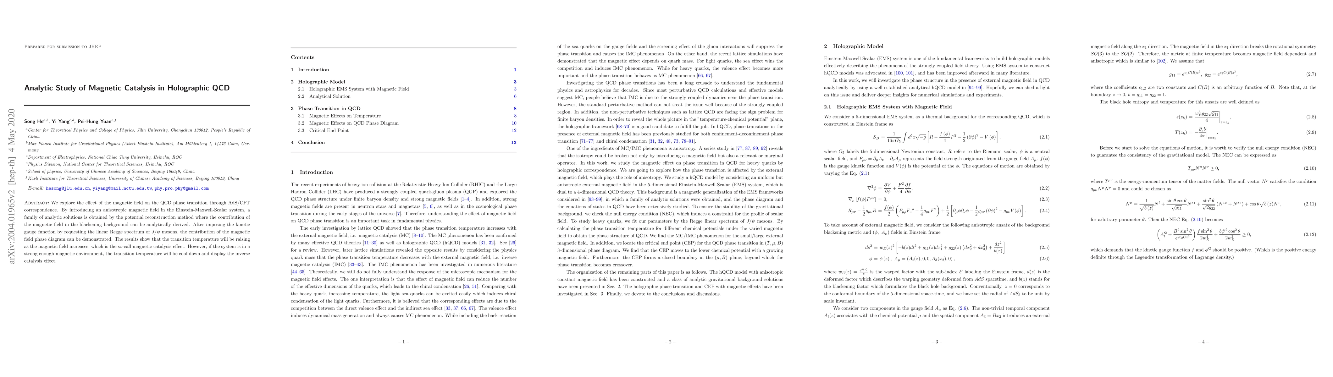 We explore the effect of the magnetic field on the QCD phase transition through AdS/CFT correspondence. By introducing an anisotropic magnetic field in the Einstein-Maxwell-Scalar system, a family of analytic solutions is obtained by the potential reconstruction method where the contribution of the magnetic field in the blackening background can be analytically derived. After imposing the kinetic gauge function by requesting the linear Regge spectrum of $J/\psi$ mesons, the contribution of the magnetic field phase diagram can be demonstrated. The results show that the transition temperature will be raising as the magnetic field increases, which is the so-call magnetic catalysis effect. However, if the system is in a strong enough magnetic environment, the transition temperature will be cool down and display the inverse catalysis effect.