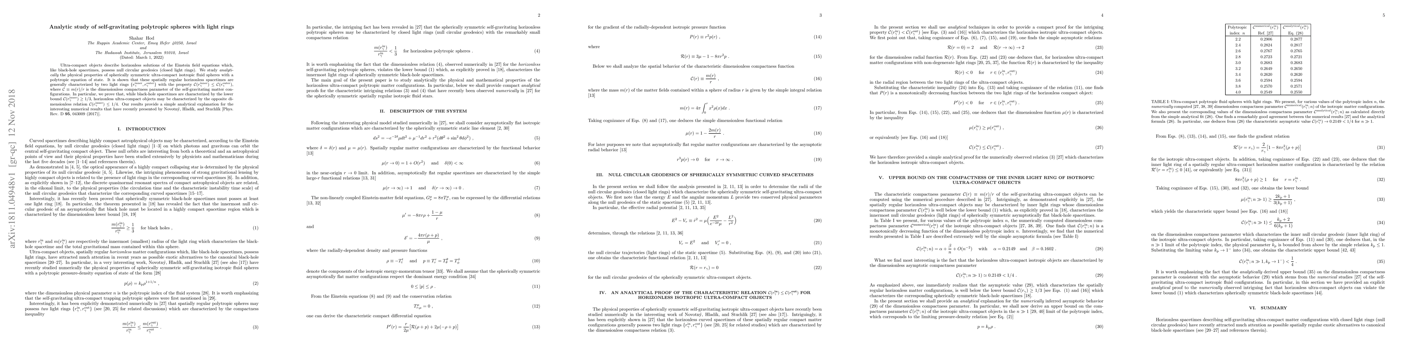 Ultra-compact objects describe horizonless solutions of the Einstein field equations which, like black-hole spacetimes, possess null circular geodesics (closed light rings). We study {\it analytically} the physical properties of spherically symmetric ultra-compact isotropic fluid spheres with a polytropic equation of state. It is shown that these spatially regular horizonless spacetimes are generally characterized by two light rings $\{r^{\text{inner}}_{\gamma},r^{\text{outer}}_{\gamma}\}$ with the property ${\cal C}(r^{\text{inner}}_{\gamma})\leq{\cal C}(r^{\text{outer}}_{\gamma})$, where ${\cal C}\equiv m(r)/r$ is the dimensionless compactness parameter of the self-gravitating matter configurations. In particular, we prove that, while black-hole spacetimes are characterized by the lower bound ${\cal C}(r^{\text{inner}}_{\gamma})\geq1/3$, horizonless ultra-compact objects may be characterized by the opposite dimensionless relation ${\cal C}(r^{\text{inner}}_{\gamma})\leq1/4$. Our results provide a simple analytical explanation for the interesting numerical results that have recently presented by Novotn\'y, Hlad\'ik, and Stuchl\'ik [Phys. Rev. D 95, 043009 (2017)].