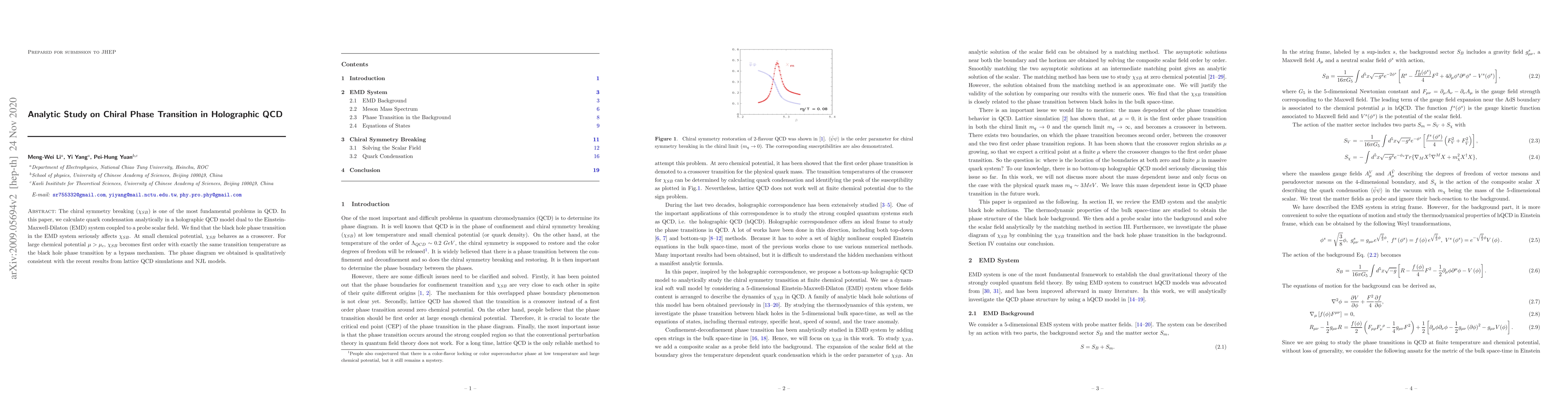 This paper analytically investigates chiral symmetry breaking in a holographic QCD model, revealing that the black hole phase transition influences $\chi_{SB}$. It finds a crossover at small chemical potentials and a first-order transition at larger chemical potentials, matching the black hole transition temperature, and aligns with lattice QCD and NJL model results.
