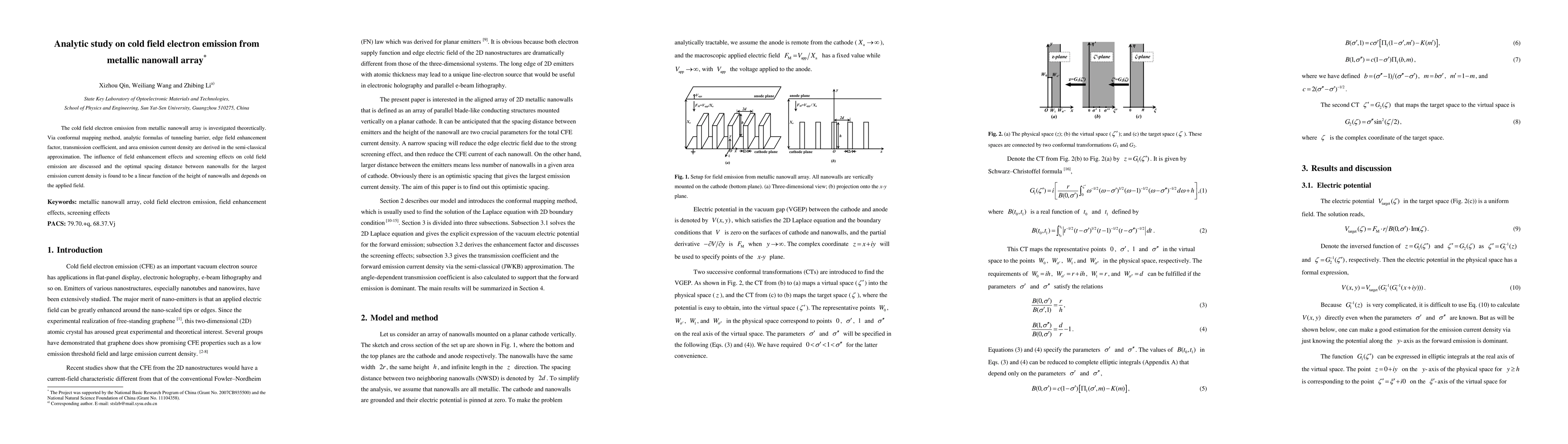 This study analytically investigates cold field electron emission from metallic nanowall arrays using conformal mapping, deriving key parameters and determining that optimal spacing for maximum emission current density is linearly dependent on nanowall height and applied field. The research highlights the influence of field enhancement and screening effects.